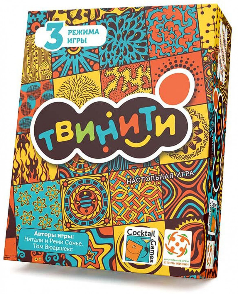 Любимая игра теперь в картонной коробке! Твинити — это стильная игра на скорость и наблюдательность с яркими узорами. Но эти узоры не так просты: казалось бы, вот же они — близнецы! А, нет, только похожи. Если вы всё же найдёте среди многообразия цветов и линий две одинаковые карты — станете на шаг ближе к победе, а найдёте три — и никто уже не сможет отобрать у вас комбинацию. Каждая партия Твинити настолько динамичная и непредсказуемая, что вы захотите возвращаться к этим гипнотическим узорам снова и снова! В игре есть 3 режима: соревновательный, командный, кооперативный.