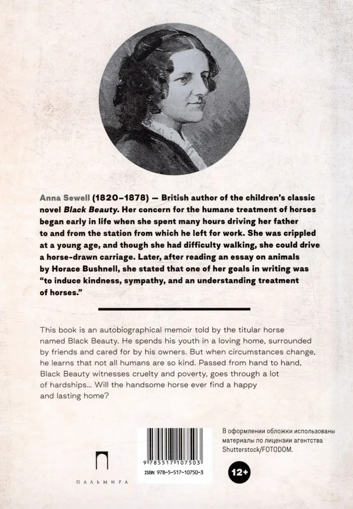💳 Оплатить за товар можно при получении 🇰🇿 Есть бесплатная доставка по Казахстану от 1 дня 🎁 Копите бонусы с каждой покупки Серия: Palmyra Classics Anna Sewell was born on 30 March 1820 in Great Yarmouth, Norfolk, England, into a devoutly Quaker family. Her father was Isaac Phillip Sewell (1793–1879), and her mother, Mary Wright Sewell (1798–1884) was a successful author of children’s books. She had one sibling, a younger brother named Philip and was largely educated at home. When she was twelve, the family moved to Stoke Newington where she attended school for the first time.Two years later, however, she slipped while walking home from school and severely injured her ankles. Her father took a job in Brighton in 1836, in the hope that the climate there would help to cure her. Despite this, and most likely because of mistreatment of her injury, for the rest of her life she could not stand without a crutch or walk for any length of time. For greater mobility, she frequently used horse-drawn carriages, which contributed to her love of horses and concern for the humane treatment of animals. |