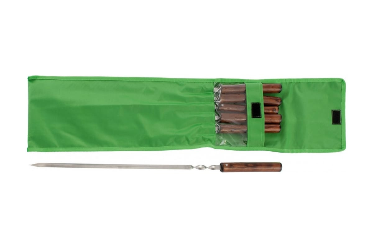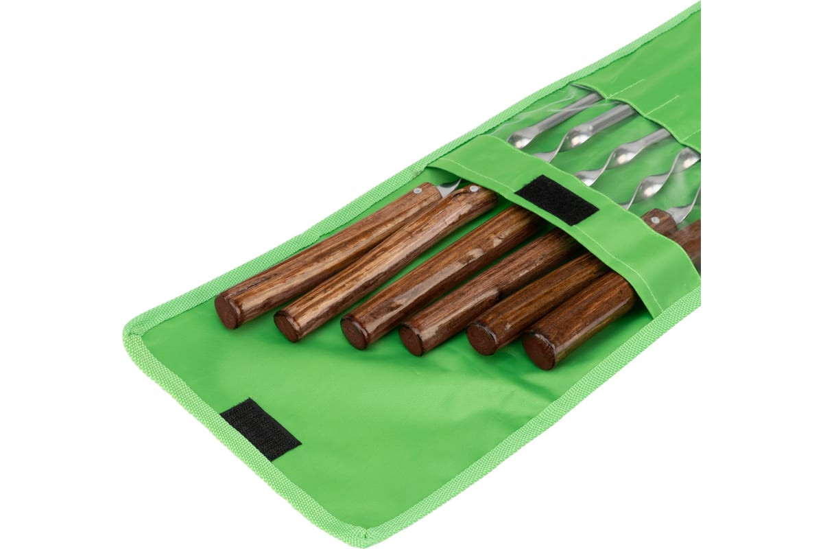 Набор угловых шампуров включает в себя 6 предметов с цельной деревянной рукояткой, упакованных в чехол. Служит для приготовления шашлыка из мяса или птицы, а также для приготовления овощей. Благодаря угловому профилю шампуров кусочки продуктов легко нанизываются и хорошо держатся на них. Набор пригодится для отдыха на даче, в походе, на пикнике.