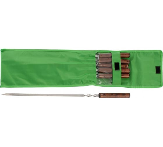 Набор плоских шампуров включает в себя 6 предметов с цельной деревянной рукояткой, упакованных в чехол. Служит для приготовления шашлыка из мяса или птицы, а также для приготовления овощей. Заостренные концы шампуров легко протыкают кусочки продуктов. Набор пригодится для отдыха на даче, в походе, на пикнике.