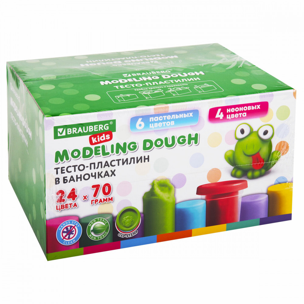 Цвета можно смешивать между собой и получать новые оттенки. Пластилин легко разминается, не липнет к рукам. Лучший вариант для тех, кто только учится лепить. Лепка развивает усидчивость и образное мышление. Каждый цвет упакован в индивидуальный пластиковый стакан с крышкой-штампиком, который не позволяет тесту высыхать. На открытом воздухе затвердевает через 24 часа. Большой набор пластилина-теста Brauberg Kids — это отличный подарок на любой праздник.