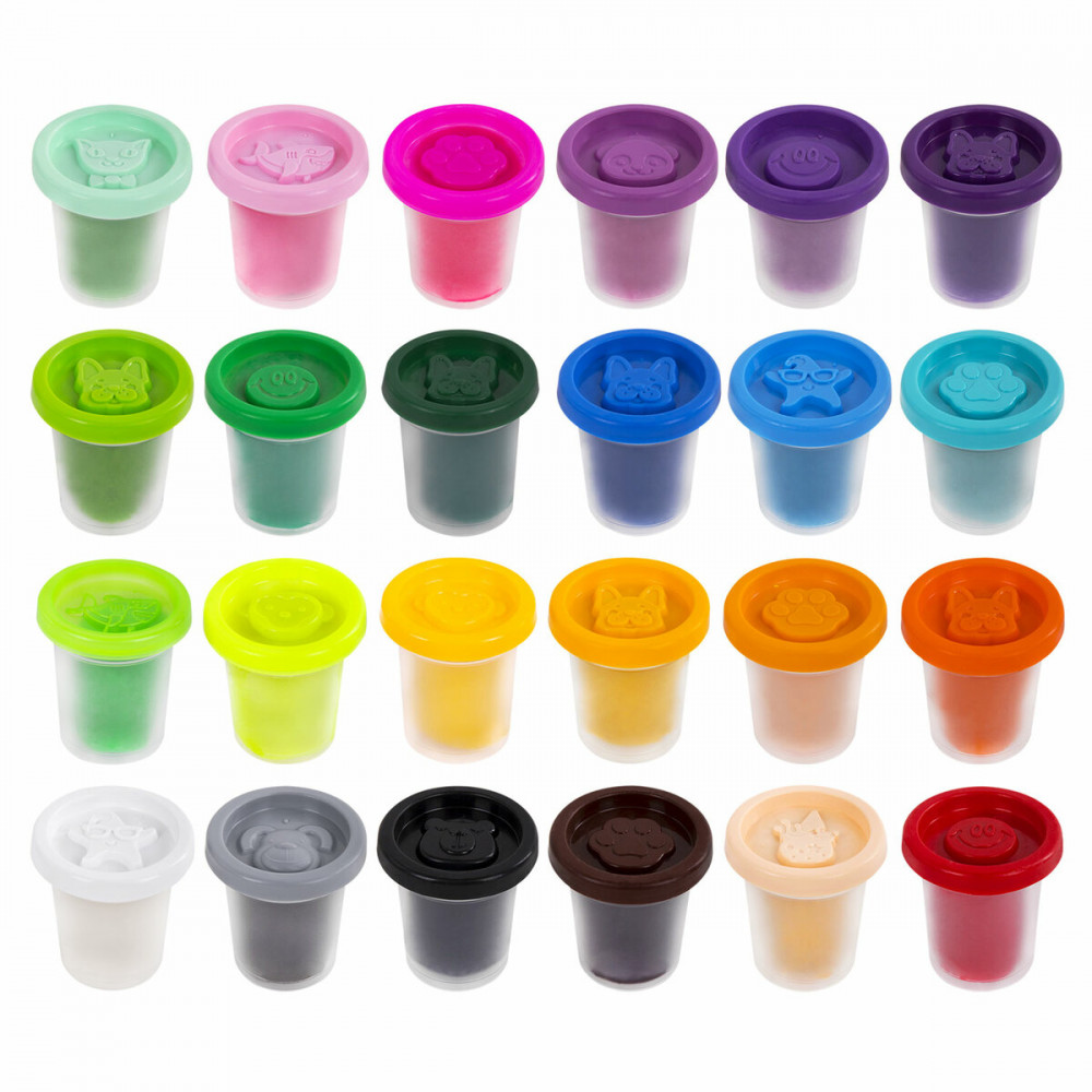 • 24 баночки теста для лепки ярких и нежных пастельных цветов (фиолетовый, оранжевый, белый, черный, красный, синий, изумрудный, желтый, неоновый голубой, неоновый салатовый, неоновый желтый, неоновый розовый, пастельный желтый, телесный, серый, пастельный салатовый, салатовый, мятный, пастельный оранжевый, фуксия, пастельный фиолетовый, пастельный розовый, бордовый, пастельный голубой).
