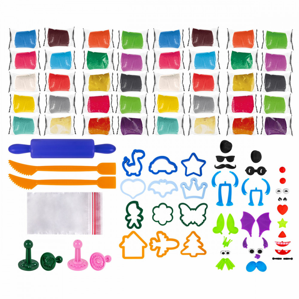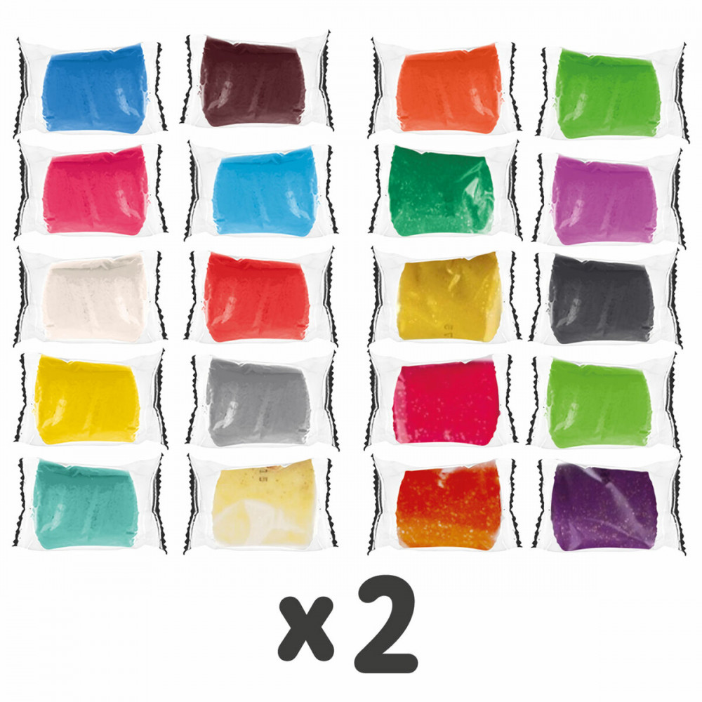 • 40 брусков теста для лепки ярких и пастельных цветов: пастельный фиолетовый, пастельный оранжевый, белый, черный, красный, синий, желтый, пастельный желтый, неоновый голубой, неоновый салатовый, пастельный салатовый, пастельный розовый, пастельный голубой, серый, изумрудный с блестками, желтый с блестками, белый с блестками, оранжевый с блестками, фиолетовый с блестками, неоновый розовый с блестками;