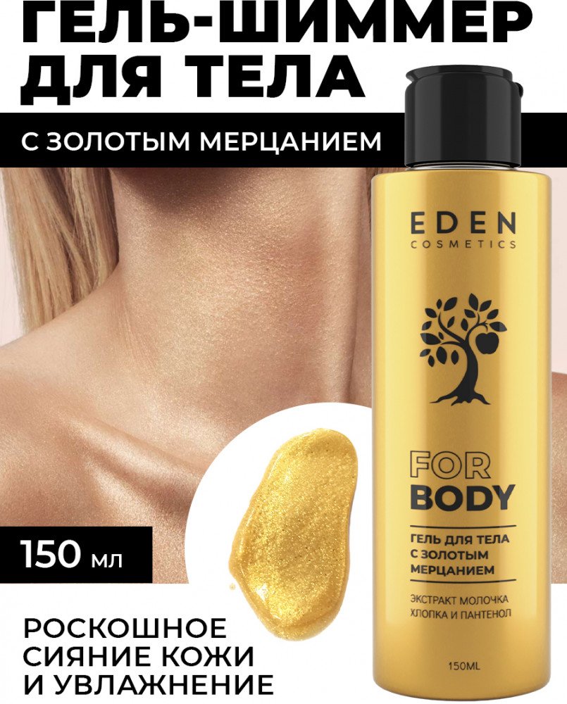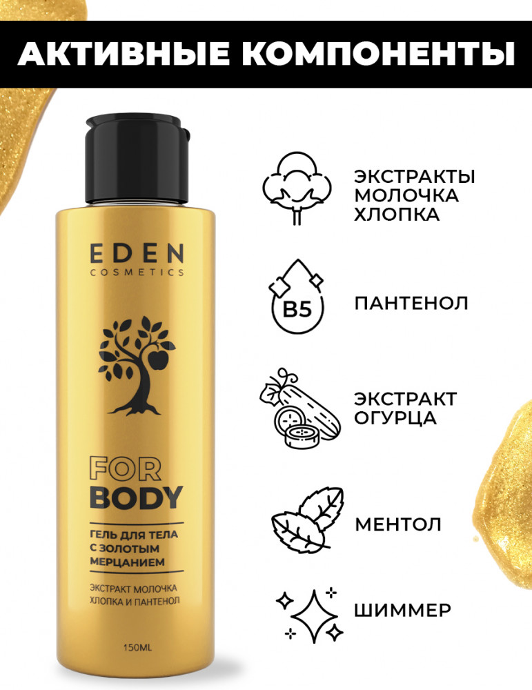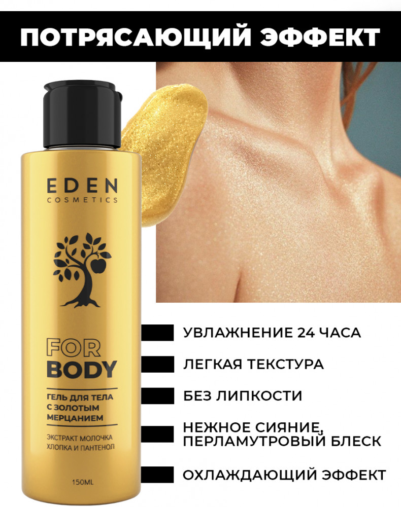 Eden cosmetics Гель для тела с золотым мерцаниемВ данный момент этот товар отсутствует в продаже. Возможно, у нас найдется аналогичный или похожий товар здесь. Серия: For body Гель с мерцанием — золотая вуаль блесток для тела. Он легко наносится, обеспечивает дополнительное сияние коже, подчеркивает легкий загар и ухаживает за кожей. Входящие в состав геля экстракт молочка хлопка-смягчает, экстракт огурца тонизирует, пантенол обладает разглаживающим эффектом и увлажняет кожу, ментол великолепно охлаждает ее и придает свежесть. |