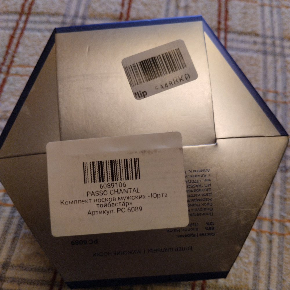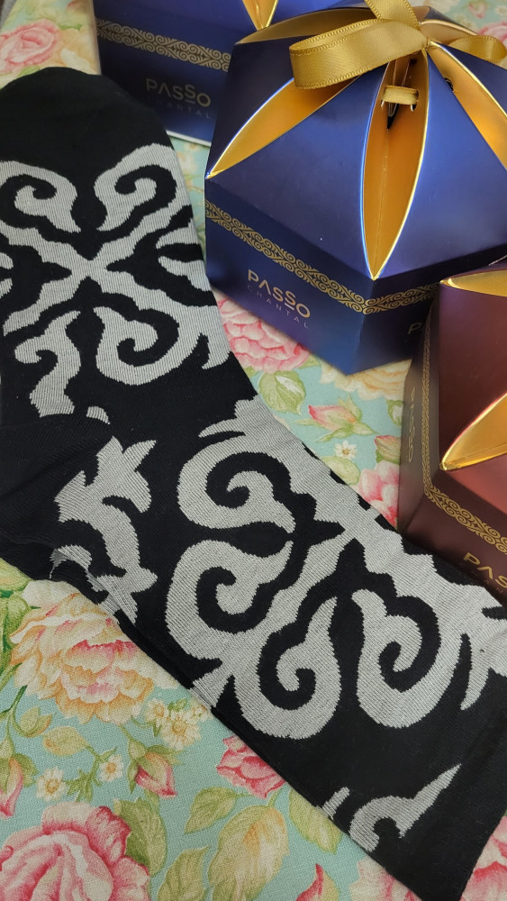 Данный товар случайно обнаружила на flip и сразу же добавила к себе в Избранное, а совсем скоро заказала в подарок. Безупречное и лаконичное исполнение товара: картонная юрта содержит две пары мужских носков с национальным орнаментом. Носки представлены в синем и чёрном цветах. Всё красиво и аккуратно. Юрта завязывается ленточкой, которую легко развязать в случае необходимости что-то добавить к носкам. У меня поместится круглый магнит с барсом (имеется здесь же на flip) и маленькая плитка шоколада "Казахстан" от "Рахат".