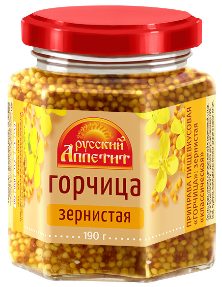 Русский аппетит Горчица зернистаяВ данный момент этот товар отсутствует в продаже. Возможно, у нас найдется аналогичный или похожий товар здесь. Горчица — знаменитая русская приправа, которая производится из цельных и молотых семян горчицы. Отлично сочетается с мясом, птицей, сосисками и колбасой. |