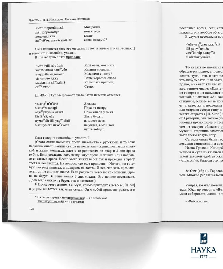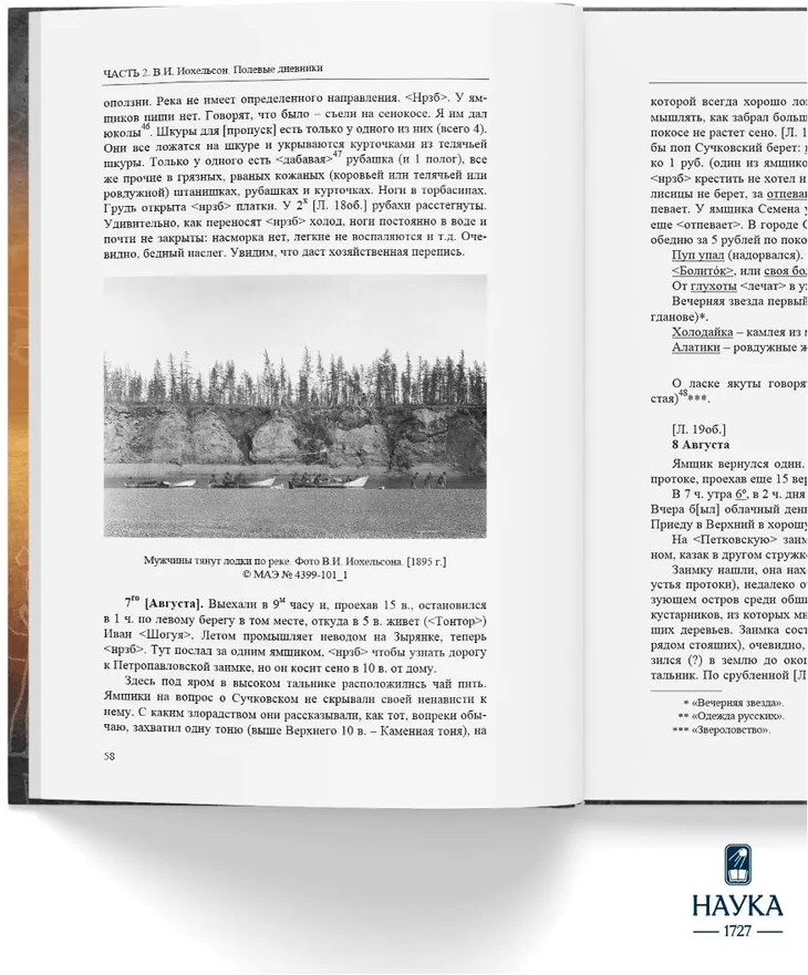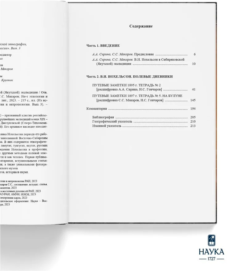 Полевые дневники из Сибиряковской (Якутской) экспедицииВ данный момент этот товар отсутствует в продаже. Возможно, у нас найдется аналогичный или похожий товар здесь. В.И. Иохельсон (1855-1937) — признанный классик российского и мирового североведения, участник трех крупнейших экспедиций конца XIX — начала XX в. — Сибиряковской (Якутской), Джезуповской (Северо-Тихоокеанской) и Рябушинского (Камчатско-Алеутской). С 1922 г. он жил в США и во Франции. Его архивное наследие находится на разных континентах. Впервые публикуются два полевых дневника Иохельсона периода его работы в Сибиряковской экспедиции (1894–1896), организованной Восточно-Сибирским отделом ИРГО. В них содержатся этнографические и фольклорные материалы о юкагирах, ламутах, тунгусах, якутах, русских якутской области. Публикация снабжена комментариями, статьями, указателями, а также фотографиями Иохельсона из российских и американского музеев. Для североведов, этнологов и антропологов, историков науки. |