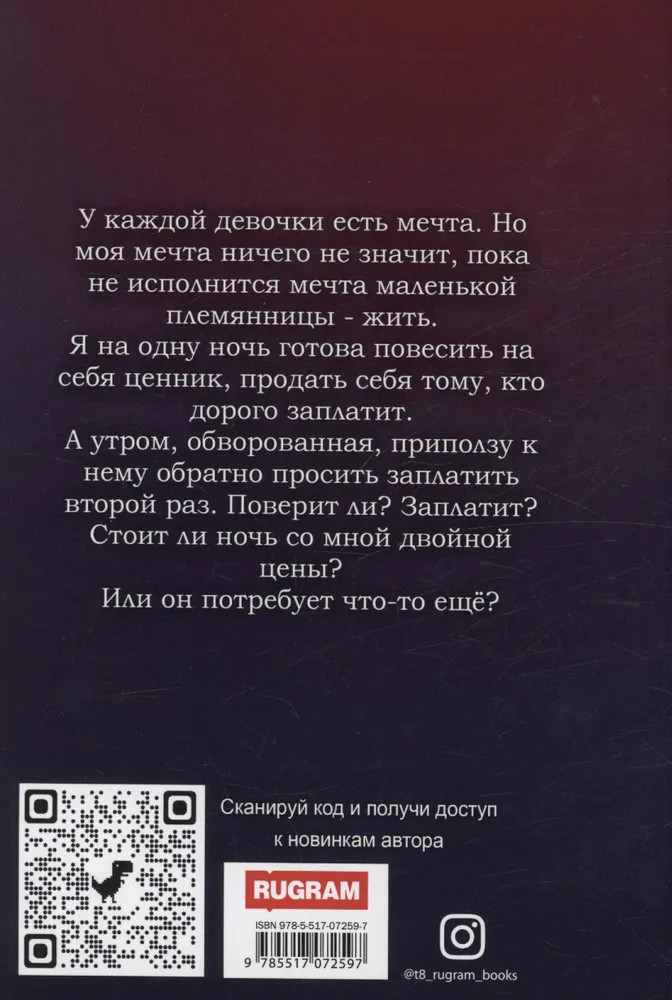 💳 Оплатить за товар можно при получении 🇰🇿 Есть бесплатная доставка по Казахстану от 1 дня 🎁 Копите бонусы с каждой покупки У каждой девочки есть мечта. Но моя мечта ничего не значит, пока не исполнится мечта маленькой племянницы — жить. Я на одну ночь готова повесить на себя ценник, продать себя тому, кто дорого заплатит. А утром, обворованная, приползу к нему обратно просить заплатить второй раз. Поверит ли? Заплатит? Стоит ли ночь со мной двойной цены? Или он потребует что-то ещё? |