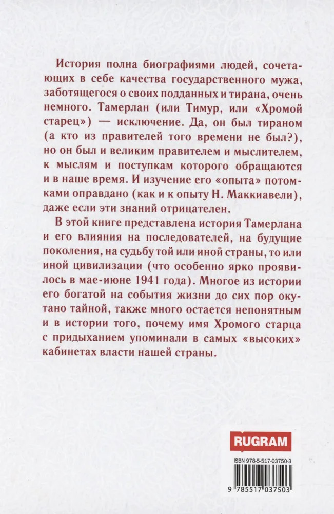 Тамерлан. Легенды жизни и смертиВ данный момент этот товар отсутствует в продаже. Возможно, у нас найдется аналогичный или похожий товар здесь. Тамерлан (или Тимур, или «Хромой старец») был тираном (а кто из правителей того времени не был?), но он был и великим правителем и мыслителем, к мыслям и поступкам которого обращаются и в наше время. И изучение его «опыта» потомками оправдано (как и к опыту Н. Маккиавели), даже если опыт этих знаний отрицателен. В этой книге представлена история Тамерлана и его влияния на последователей, на будущие поколения, на судьбу той или иной страны, той или иной цивилизации (что особенно ярко проявилось в мае-июне 1941 года). Многое из истории его богатой на события жизни до сих пор окутано тайной, также много остается непонятным и в истории того, почему имя Хромого старца с придыханием упоминали в самых «высоких» кабинетах власти нашей страны. |
