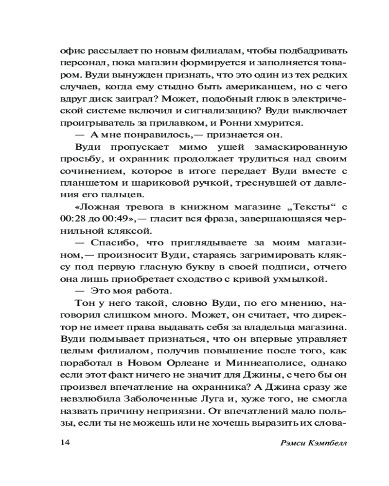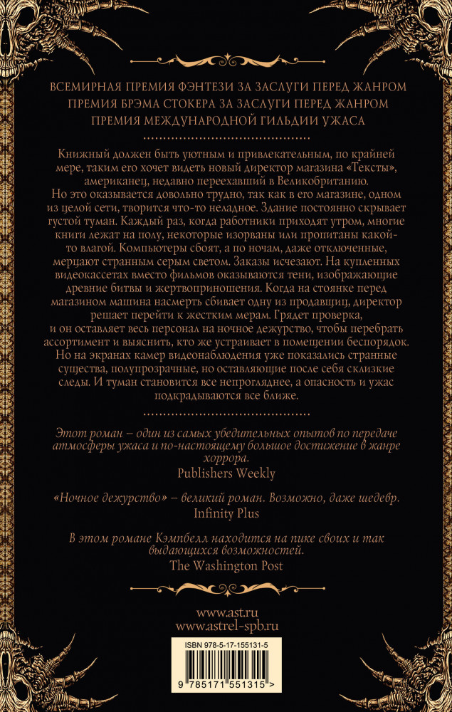 💳 Оплатить за товар можно при получении 🇰🇿 Есть бесплатная доставка по Казахстану от 1 дня 🎁 Копите бонусы с каждой покупки Серия: Легенды хоррора Книжный должен быть уютным и привлекательным, по крайней мере, таким его хочет видеть новый директор магазина «Тексты», американец, недавно переехавший в Великобританию. Но это оказывается довольно трудно, так как в его магазине, одном из целой сети, постоянно творится что-то неладное. Во-первых, здание постоянно скрывает густой туман. Каждый раз, когда работники приходят утром, многие книги лежат на полу, некоторые изорваны или пропитаны какой-то влагой. Компьютеры сбоят, а по ночам, даже отключенные, мерцают странным серым светом. Заказы исчезают. На купленных видеокассетах вместо фильмов оказываются тени, изображающие древние битвы и жертвоприношения. Когда на стоянке перед магазином машина насмерть сбивает одну из продавщиц, директор решает перейти к жестким мерам. |
