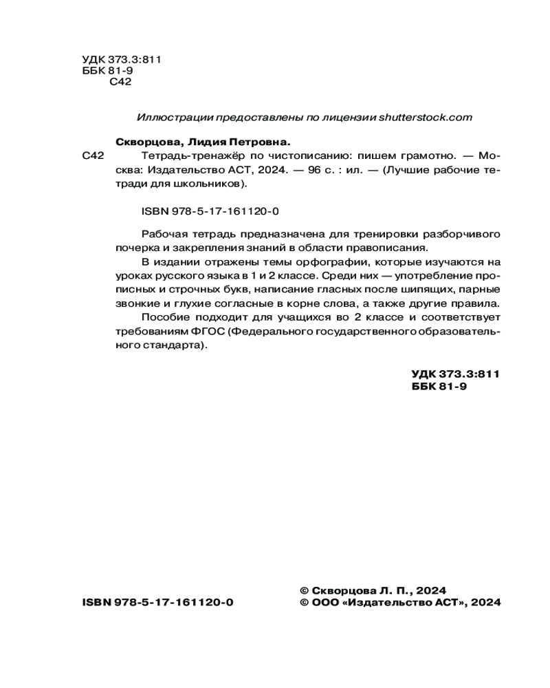 💳 Оплатить за товар можно при получении 🇰🇿 Есть бесплатная доставка по Казахстану от 1 дня 🎁 Копите бонусы с каждой покупки Серия: Лучшие рабочие тетради для школьников Рабочая тетрадь предназначена для тренировки разборчивого почерка и закрепления знаний в области правописания. В издании отражены темы орфографии, которые изучаются на уроках русского языка в 1 и 2 классе. Среди них — употребление прописных и строчных букв, написание гласных после шипящих, парные звонкие и глухие согласные в корне слова, а также другие правила. Пособие подходит для учащихся во 2 классе и соответствует требованиям ФГОС (Федерального государственного образовательного стандарта). |