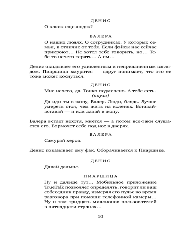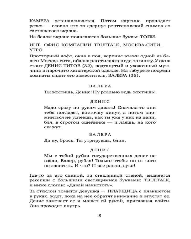 Книга написана в стиле сценария, не удивительно, так как сценаристом одноименного сериала является Дмитрий Глуховский. В целом книга достаточно интересна, интересно читать даже после просмотра сериала