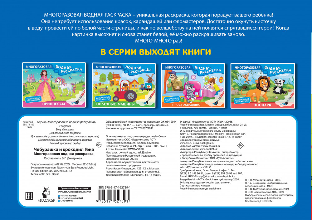 💳 Оплатить за товар можно при получении 🇰🇿 Есть бесплатная доставка по Казахстану от 1 дня 🎁 Копите бонусы с каждой покупки Серия: Многоразовые водные раскраски «Чебурашка и Крокодил Гена. Многоразовая водная раскраска» — не обычная раскраска, а волшебная книжка для маленьких художников. Малыши узнают, что рисовать и раскрашивать можно не только карандашами, фломастерами или красками, но и водой. Проведёшь мокрой кисточкой по бумаге — и перед тобой яркая картинка. Когда вода высохнет, рисунок снова станет чёрно-белым, и его можно будет раскрашивать заново! |