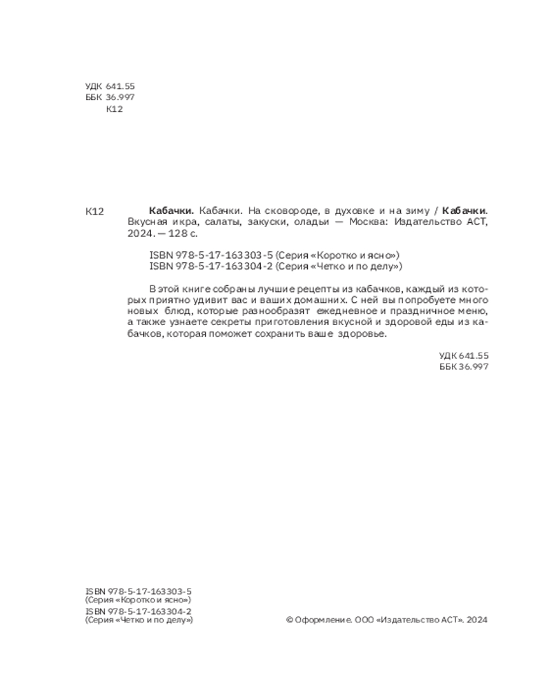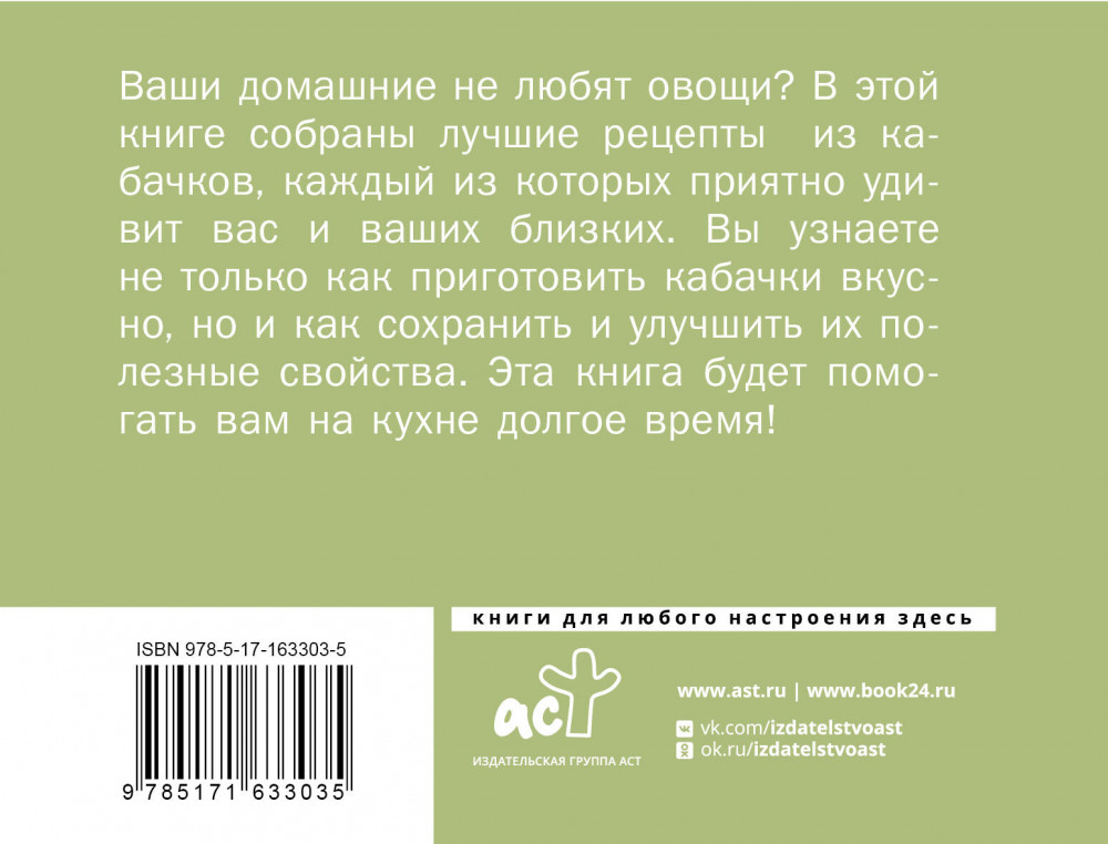 Кабачки. На сковороде, в духовке и на зимуВ данный момент этот товар отсутствует в продаже. Возможно, у нас найдется аналогичный или похожий товар здесь. Серия: Коротко и ясно В этой книге собраны лучшие рецепты из кабачков, каждый из которых приятно удивит вас и ваших домашних. С ней вы попробуете много новых блюд, которые разнообразят ежедневное и праздничное меню, а также узнаете секреты приготовления вкусной и здоровой еды из кабачков, которая поможет сохранить ваше здоровье. |