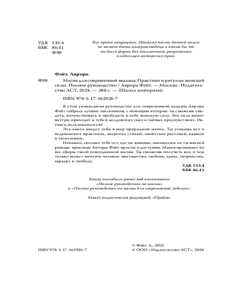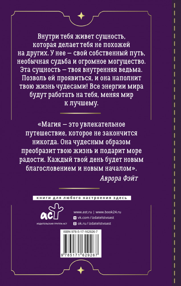 💳 Оплатить за товар можно при получении 🇰🇿 Есть бесплатная доставка по Казахстану от 1 дня 🎁 Копите бонусы с каждой покупки Серия: Школа эзотерики Эта книга написана магической наставницей Авророй Фэйт, чтобы помочь тебе развить и укрепить связь с силами природы и твоей женской энергией. Эту силу ты встретишь повсюду, она живет внутри тебя. Ее пульс бьется в унисон с ритмом большого города, она открывается тебе в колдовских снах и тайных предчувствиях. Используя ее, ты сможешь проводить магические ритуалы, накладывать сильные заклинания и творить реальность вокруг себя. |