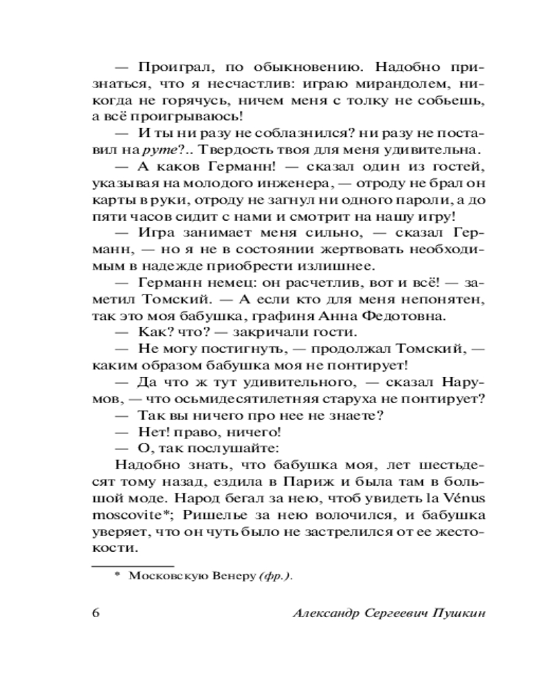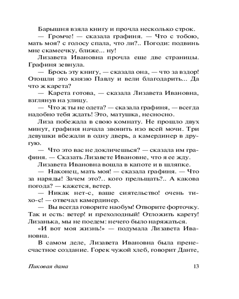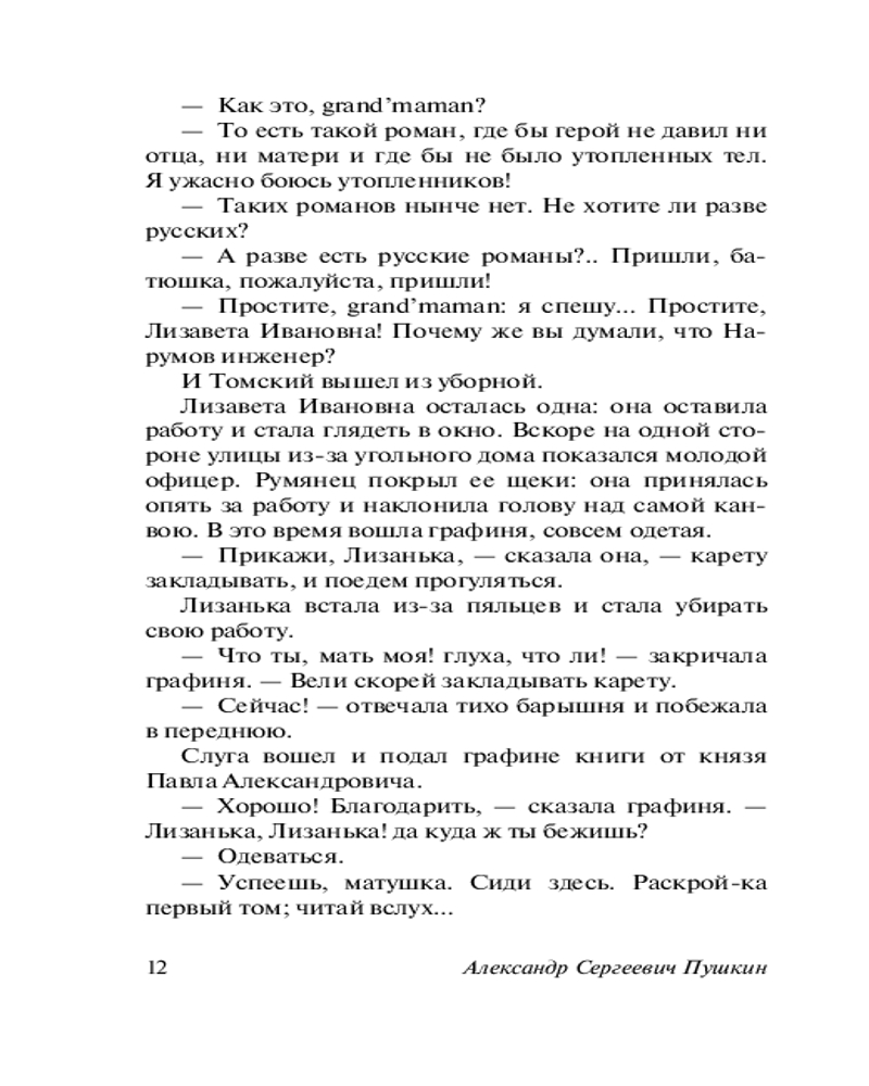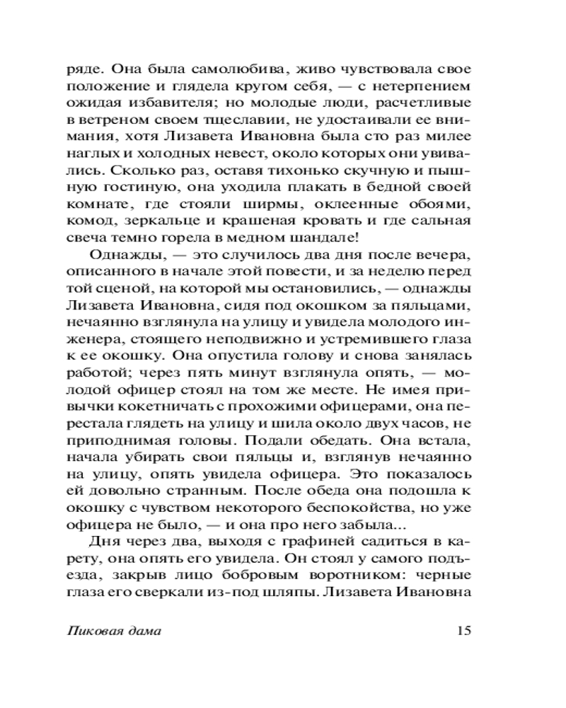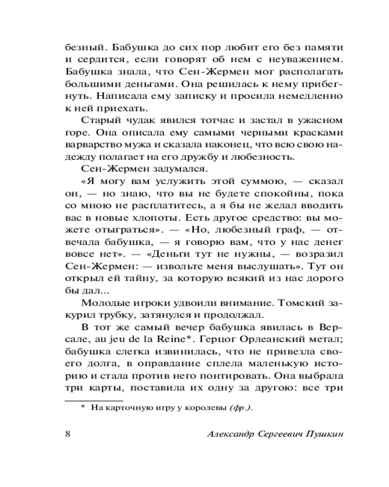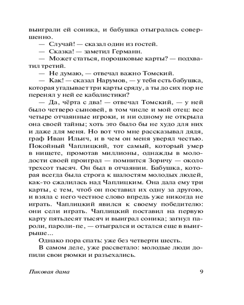 Что наша жизнь? Игра! «Пиковая Дама» великого и бессмертного Александра Сергеевича Пушкина щедро наделённая мистическими элементами и послужившая источником сюжета для одноимённой оперы П. И. Чайковского (а также, видимо, для «детской» игры, когда собравшись в полностью тёмной комнате весёлая компания пытается призвать через зеркало Пиковую Даму… «Пиковая дама отзовись» сказанное три раза и… хммм… возможно, эта компания уже не будет столь весёлой 😏) - это, на мой скромный и чисто субъективный взгляд, Абсолютно Лучшее и самое характернейшее для Пушкина произведение в прозе. И моё любимейшее. Без вариантов и альтернатив. Изложить его вкратце невозможно: это шедевр сжатости. Всего-то жалких 60 страниц, но зато КАКИХ! В них заложен такой массив, что другому автору не хватит и 600. Как и «Повести Белкина», это произведение чистого искусства, гениально в своей целостности. По силе воображения данная повесть превосходит всё, что написал Пушкин в прозе (опять-таки, пусть это прозвучит слишком уж субъективно, но как есть): по напряженности она похожа на сжатую пружину. Читается на одном дыхании, чтобы перевести дух попросту нет времени. По неистовому своему романтизму она близка к «Гимну Чуме» и к стихотворению «Не дай мне Бог сойти с ума». Но фантастический и романтический сюжет влит в безукоризненную классическую форму, такую экономную и сжатую в своей благородной наготе, что даже Проспер Мериме, самый изощренно-экономный из французских писателей, не решился перевести её точно и приделал к своему французскому переводу всякие украшения и пояснения, думая, вероятно, что наращивает мясо на сухом скелете. Однако… он сильно заблуждался. Повесть безукоризненна и идеальна в своей одновременно литературной краткости и контекстуальной всеобъемлемости. Неутолимая жажда денег и наживы уродующие человека, стремление к личному обогащению за чужой счёт и тяга к власти – одни из центральных лейтмотивов маленького шедевра Александра Сергеевича. Подобная тематика служила ответом на самые животрепещущие процессы эпохи - власть золота над людьми и того, насколько чудовищные обличия она принимает порой. В "Пиковой даме" Пушкин обратился к широкому кругу проблем: человек, свобода нравственного выбора, судьба, предопределение, случайность и закономерность, игра, азарт и зависимость от него (этот «кокаин» не вывести из своей крови никакими средствами - он часть тебя, и это куда опаснее любого наркотика), «злодейство» - лишь некоторые из философских вопросов, осмысляемых автором в этой повести. Название позволяет нам сравнить повесть с карточной игрой, где карты - персонажи произведения, а игроки - те силы, что способны распоряжаться картами (персонажами) по своей воле. Пиковая дама становится не только картой в игре Германна с Судьбой, но и местью Судьбы за пренебрежение Человеком своим Словом и Принципом. Карточный долг - долг Чести. Дело Принципа - это не блажь, а основа Жизненного Пути. Так всегда было и всегда будет. И не позавидуешь тому, кто в запальчивости своей гордыни забывает об этом. Главный герой сам оказывается картой в более крупной игре, и его карта была бита. Он уже отыгран в этой партии. Но не стоит забывать и про Её Величество - Карму. Какой всё-таки стороной упадёт монетка? Какие карты лягут в твои руки? Случайность? Нет, закономерность. В
