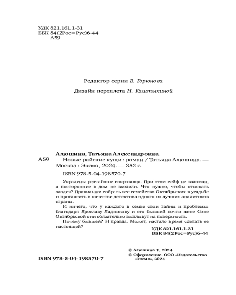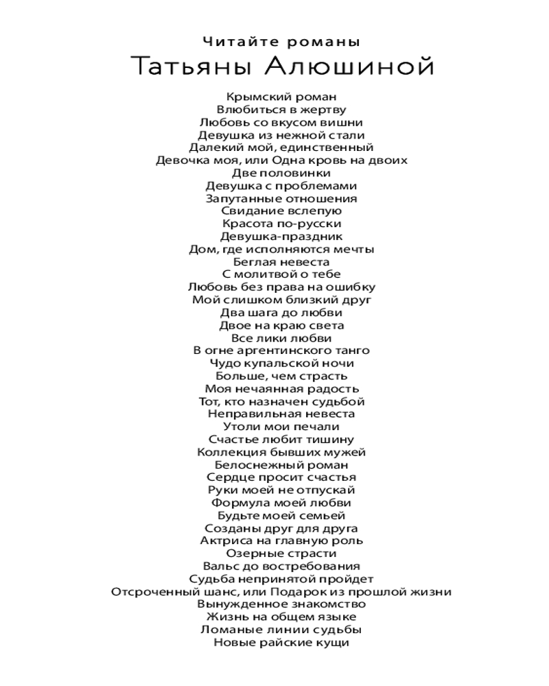 💳 Оплатить за товар можно при получении 🇰🇿 Есть бесплатная доставка по Казахстану от 1 дня 🎁 Копите бонусы с каждой покупки Серия: Еще раз про любовь. Романы Т. Алюшиной Искрометный микс элементов французского детектива, любви и семейных разборок в стиле дачного кооператива, умноженный на утонченный юмор и легкую иронию. Немного истории и редкого в наше время аристократизма от одного из известнейших авторов сентиментальной литературы. Ищите сокровища с лучшим аналитиком страны и его любимой девушкой, решайте семейные проблемы семейства Октябрьских и наслаждайтесь по-снайперски идеальным финалом! |