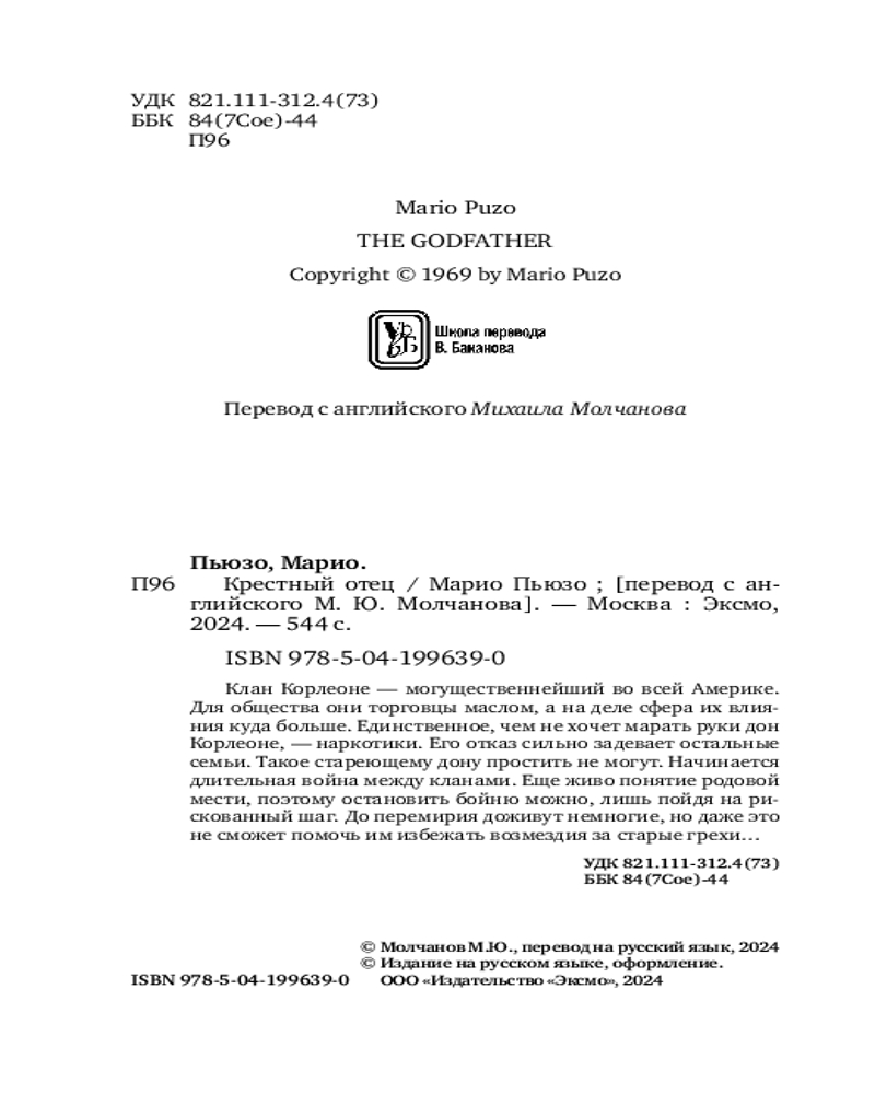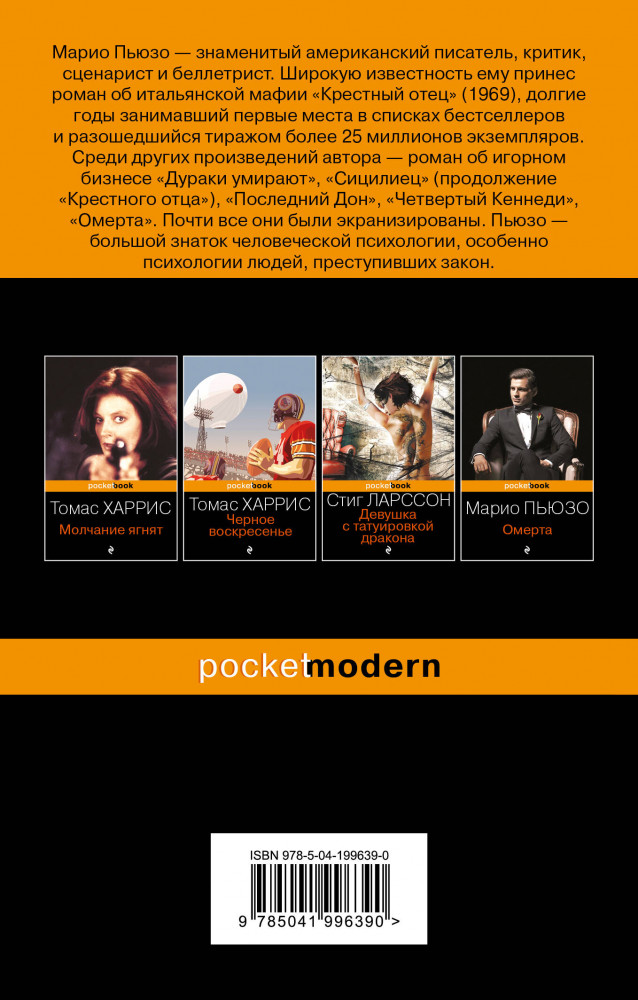 💳 Оплатить за товар можно при получении 🇰🇿 Есть бесплатная доставка по Казахстану 🎁 Копите бонусы с каждой покупки Серия: Pocket Book (обложка) Клан Корлеоне — могущественнейший во всей Америке. Для общества они торговцы маслом, а на деле сфера их влияния куда больше. Единственное, чем не хочет марать руки дон Корлеоне, — наркотики. Его отказ сильно задевает остальные семьи. Такое стареющему дону простить не могут. Начинается длительная война между кланами. Еще живо понятие родовой мести, поэтому остановить бойню можно, лишь пойдя на рискованный шаг. До перемирия доживут немногие, но даже это не сможет помочь им избежать возмездия за старые грехи... |
