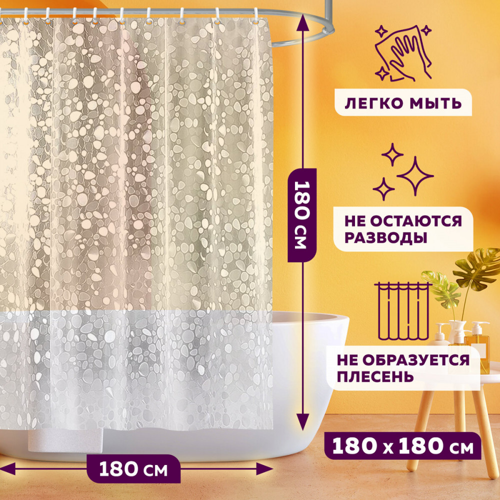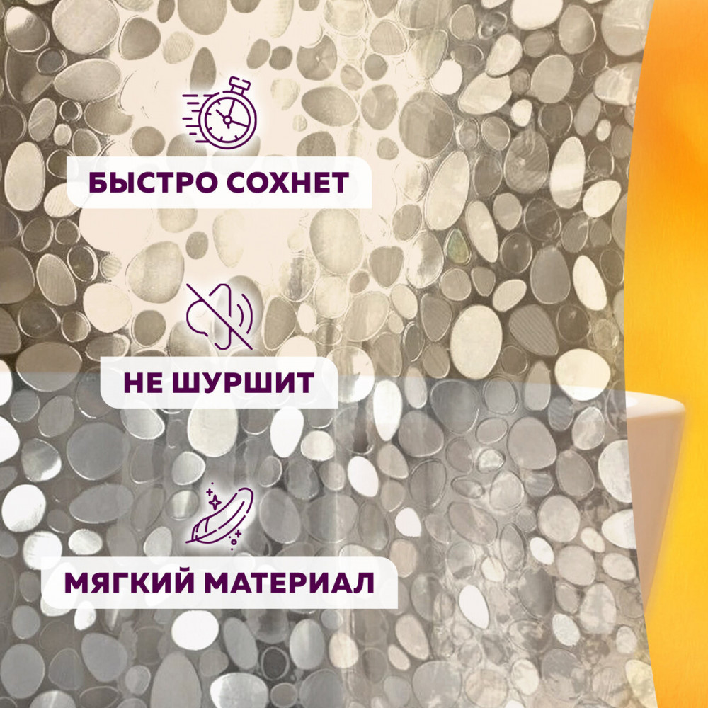 Штора для ванной комнаты с эффектом 3D Laima Home — залог чистоты и уюта ванной комнаты. Используется для защиты пола, стен, мебели и зеркала от брызг. Изготовлена из качественного, практичного, износостойкого, гипоаллергенного EVA материала, гарантирующего отсутствие заломов и водонепроницаемость. Быстро сохнет, не шуршит, без запаха и приятная на ощупь. Верхний край оснащен надежным креплением — люверсами из нержавеющей стали, сквозь которые проходят кольца из ABS-пластика, которые подходят к любым прямым и угловым штангам.
