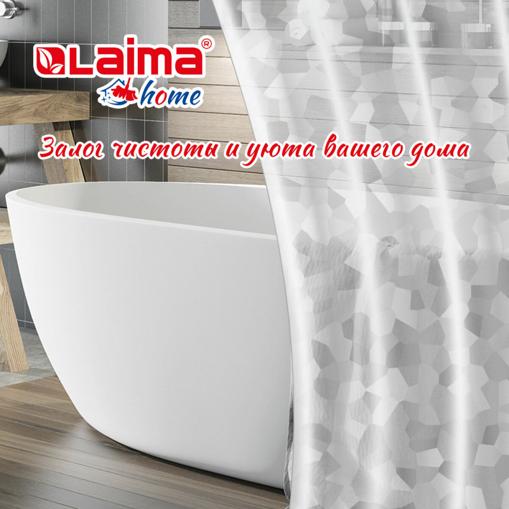 Штора для ванной комнаты с эффектом 3D Laima Home — залог чистоты и уюта ванной комнаты. Используется для защиты пола, стен, мебели и зеркала от брызг. Изготовлена из качественного, практичного, износостойкого, гипоаллергенного EVA материала, гарантирующего отсутствие заломов и водонепроницаемость. Быстро сохнет, не шуршит, без запаха и приятная на ощупь. Верхний край оснащен надежным креплением — люверсами из нержавеющей стали, сквозь которые проходят кольца из ABS-пластика, которые подходят к любым прямым и угловым штангам.