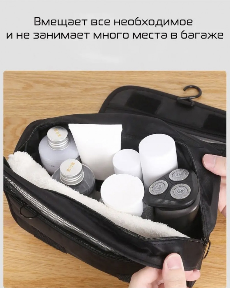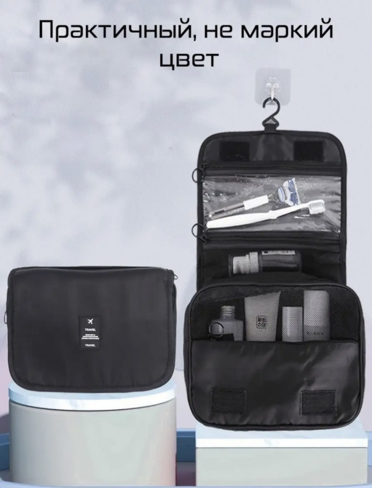 Выполнен из высококачественных и водоотталкивающих материалов. Внутри имеется большой отсек для хранения баночек, бутылочек , расчесок и т.д. , далее расположено отделение, которое выполнено из плотной сетчатой ткани и непромокаемый прозрачный отсек из клеенчатого материала. Все отделения закрываются при помощи удобной молнии и дополнительно на прочные липучки. Также, набор имеет специальный крючок для удобного подвесного хранения, благодаря которому очень удобно доставать предметы обихода. Дорожная сумка поможет организовать вещи во время поездки или командировки.