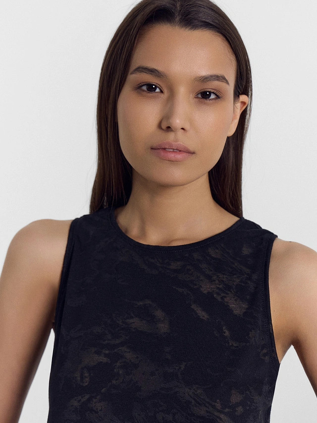 Отличный укороченный, свободный, слегка просвечивающий, дышащий топ. Прорези для рук не слишком большие.