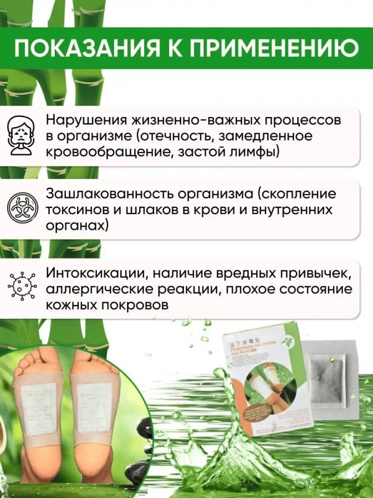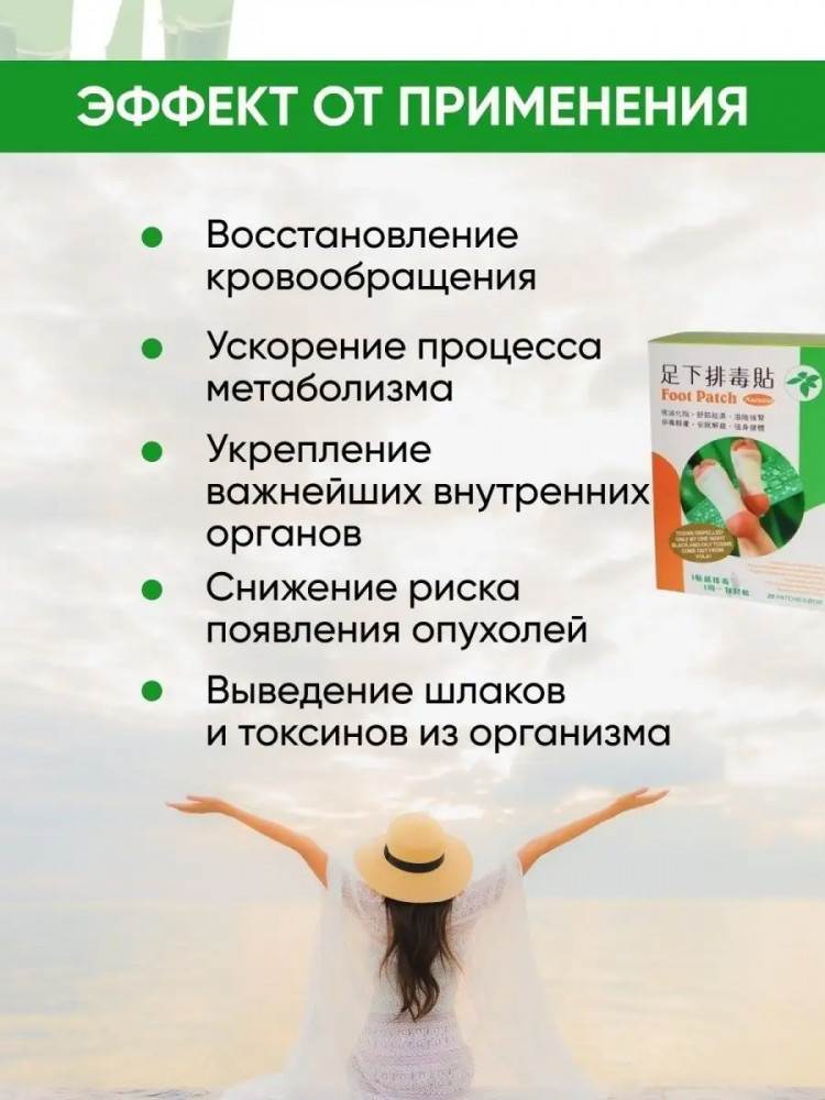 Что поможет очистить организм от токсинов всего за 10 дней? Нет ничего проще! Просто приклеив к ногам DETOX-пластыри! Наверное вы слышали, что низкая работоспособность и плохое самочувствие — это результат интоксикации и зашлаковки организма. Нарушается нормальное кровообращение, так как токсины постепенно накапливаются в организме человека, из-за чего могут возникнуть различные заболевания. Есть простой, доступный и проверенный способ, не требующий больших усилий. Это очищающий пластырь для выведения токсинов Foot Patch Детокс. Все, что вам нужно сделать, это наклеить его на сухую и чистую подошву стоп перед сном и оставить до утра. Вы спите, а пластырь работает. Пластырь «Foot Patch» Детокс взаимодействует с кожей, как с выделительной системой, связывающей внутренние органы с внешней средой. А подошвы стоп — это место скопления огромного количества активных точек, через которые и осуществляется эта связь.
