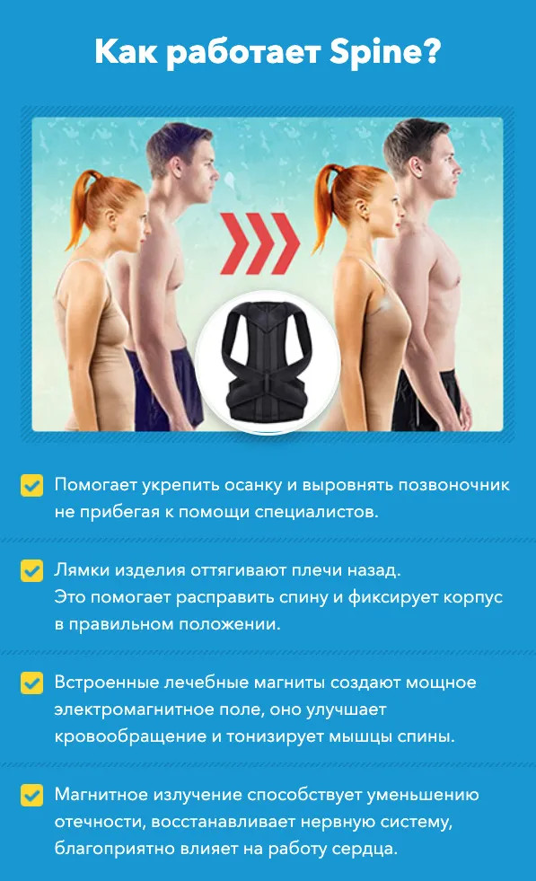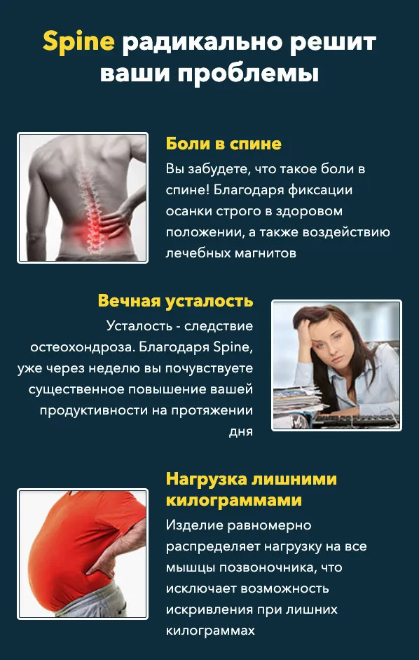 Достойным выходом при болях в спине может стать корректор Spine. Уникальная разработка способная восстановить физиологически правильное положение позвоночника, избавить от сутулости, снять отеки, обезболить и, наконец, приучить нашу спину к красивому внешнему виду. Spine — залог безупречной осанки и крепких мышц спины!
