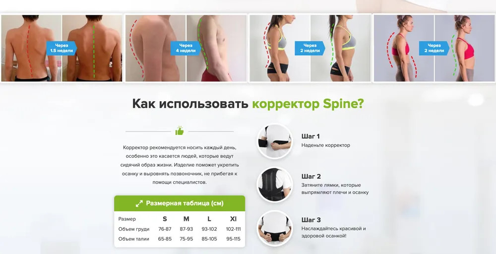 Плотное облегание корсетных связок моментально расправляет спину, выпрямляет позвоночник, задает правильное положение, способное тренировать спину для самостоятельного поддержания правильной осанки. Применение корректора осанки Spine уже менее чем через месяц регулярного ношения способно восстановить и привнести закрепление правильного положения позвоночника на долгие годы.