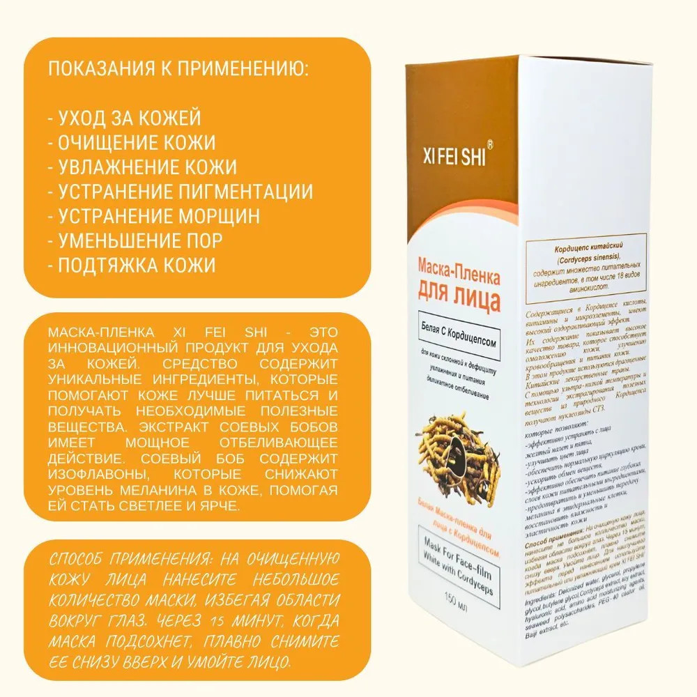 Маска-пленка Xi Fei Shi — это инновационный продукт для ухода за кожей. Средство содержит уникальные ингредиенты, которые помогают коже лучше питаться и получать необходимые полезные вещества. Экстракт соевых бобов имеет мощное отбеливающее действие. Соевый боб содержит изофлавоны, которые снижают уровень меланина в коже, помогая ей стать светлее и ярче.