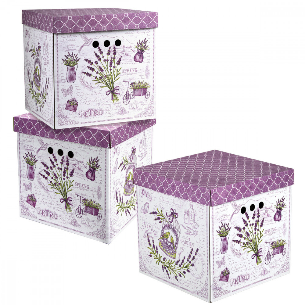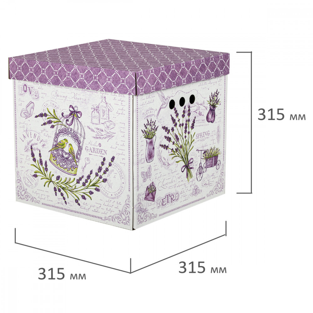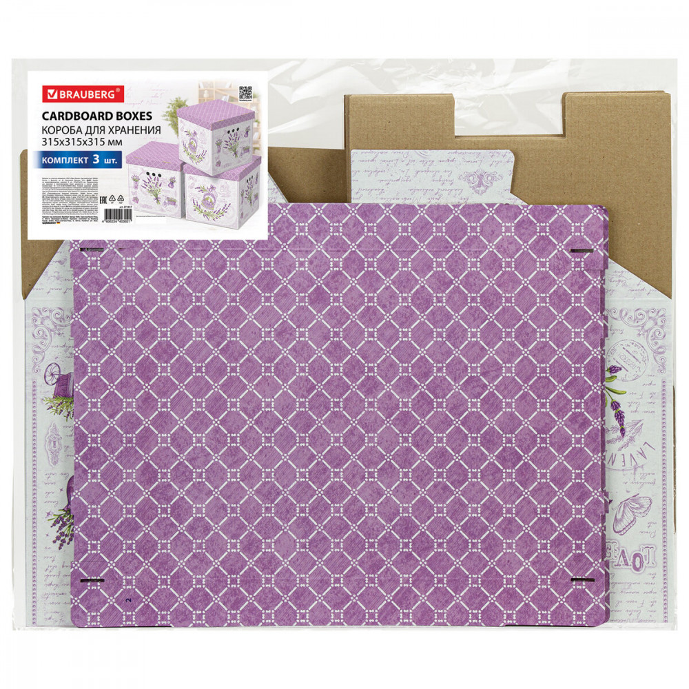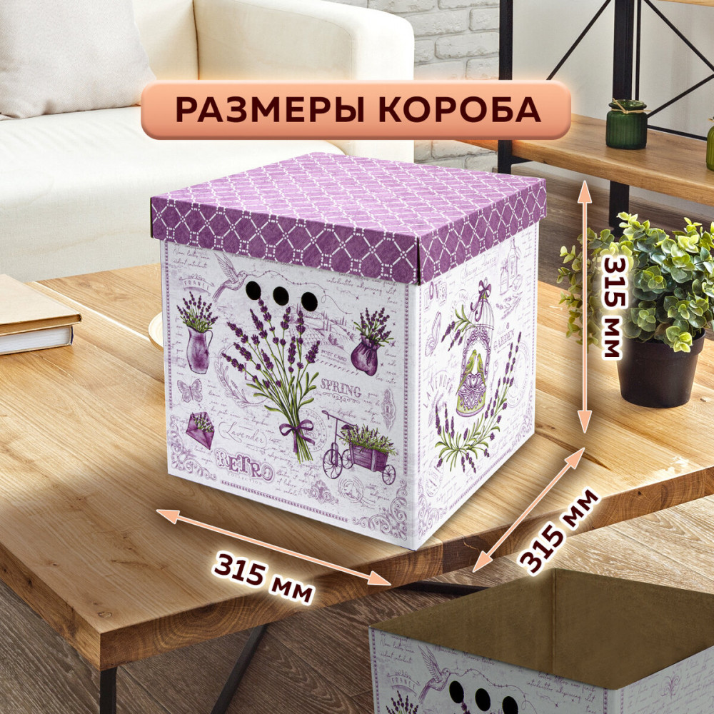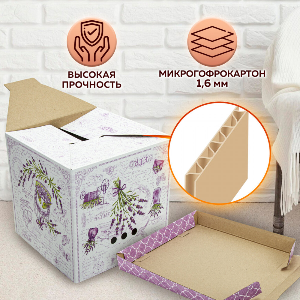 В комплект входят 3 короба размером 31.5×31.5×31.5 см со съемными крышками, изготовленные из плотного экологичного микрогофрокартона толщиной 1,6 мм. Короб отлично держит форму, а для удобства перемещения на боковых сторонах имеются круглые отверстия. Разноцветный рисунок в виде лавандовой темы не позволит коробам затеряться на полках и стеллажах в вашей квартире или офисе. Для обеспечения сохранности поставляются в разобранном виде. Пошаговую схему сборки можно найти на обратной стороне вкладыша. Картонные короба — идеальный вариант систематизации ваших документов и мелких предметов и организации открытого пространства.