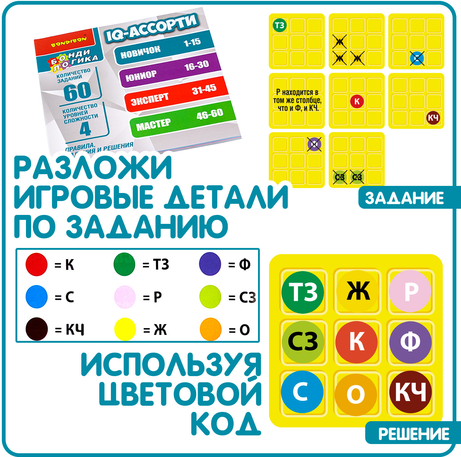 Настольная логическая игра IQ-АССОРТИ серии БондиЛогика от Bondibon содержит 60 заданий разных уровней сложности, которые позволят потренировать ум дома и в путешествии.