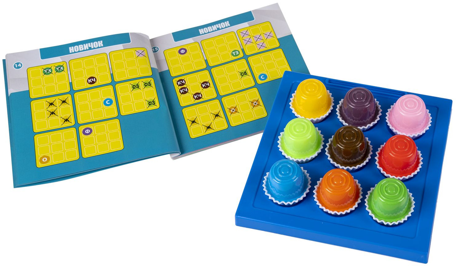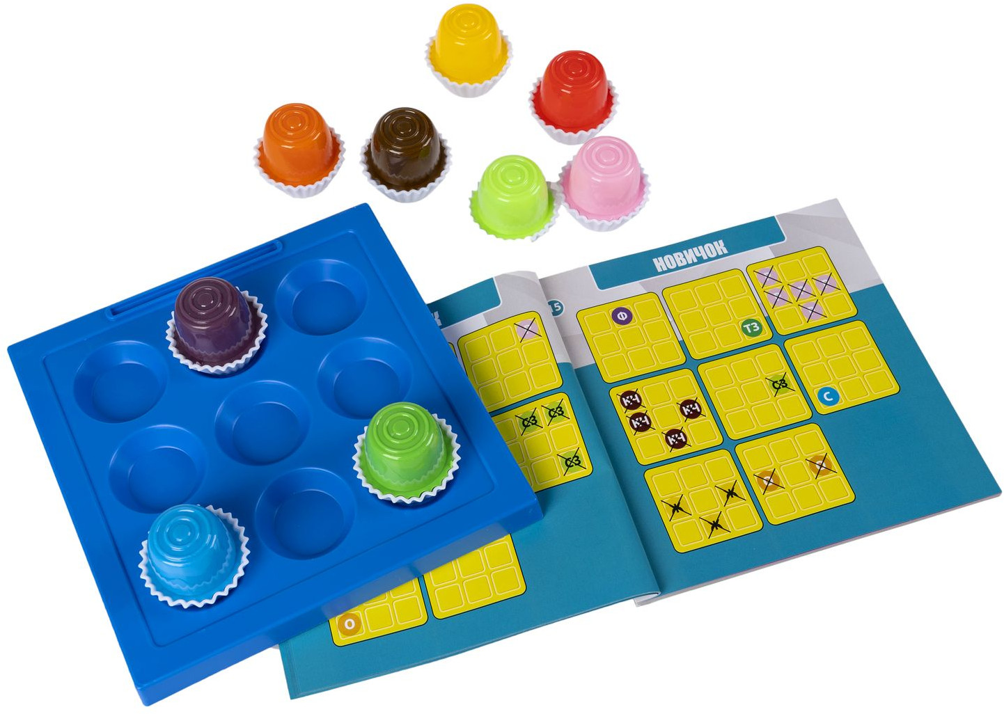 Выберите задание попроще или потруднее, ориентируясь на возраст игрока. Используйте подсказки, чтобы правильно поместить все сладости на игровое поле. Ответ можно проверить по буклету.