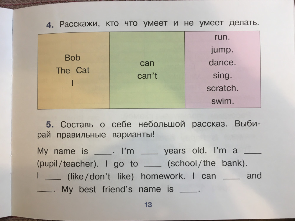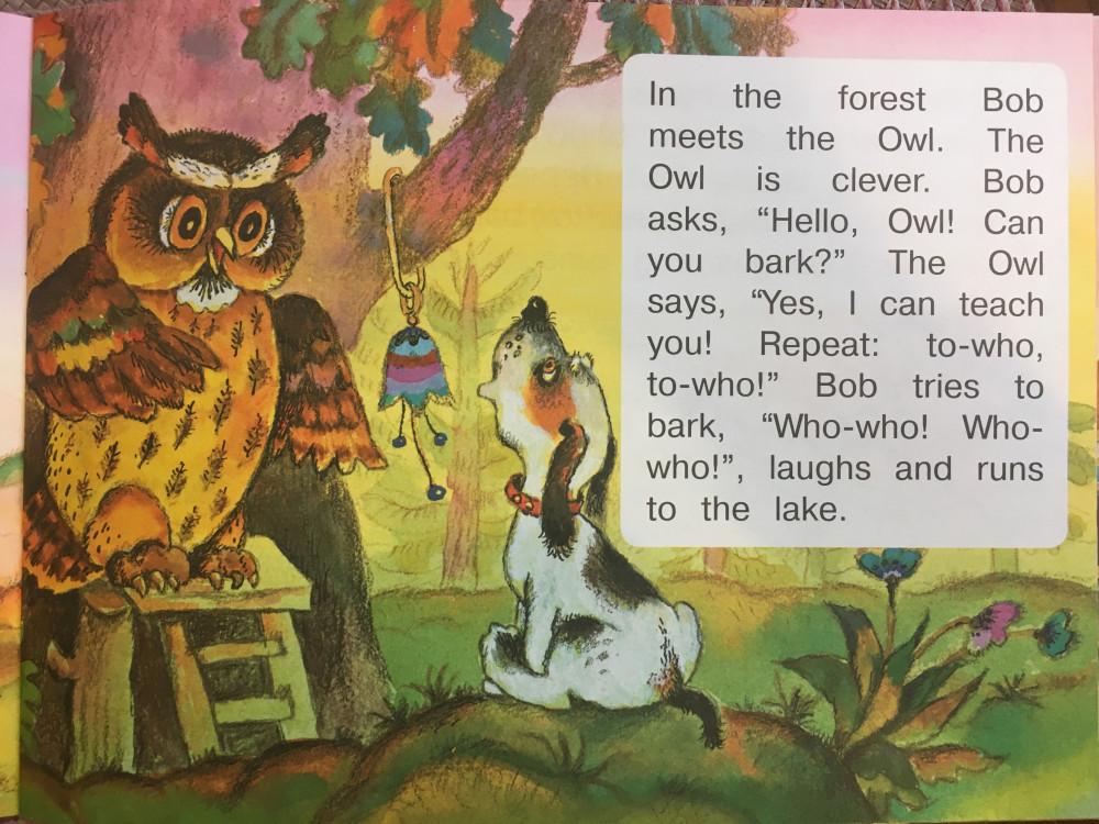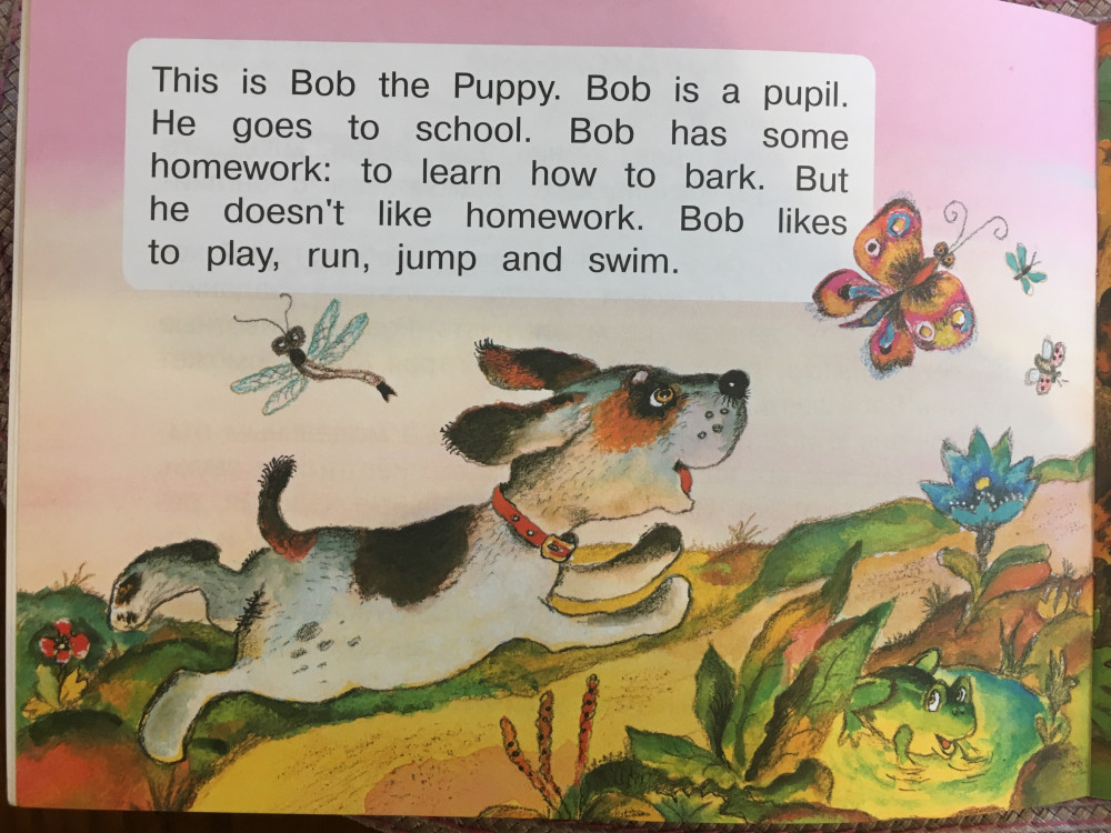 Рассказ про щенка, который не умел лаять. Его учили разные животные. Вводится глагол "can" и союз "because", названия нескольких животных и звуки, которые они издают. Минус звезда - за неточные картинки, например, индюк разноцветный.