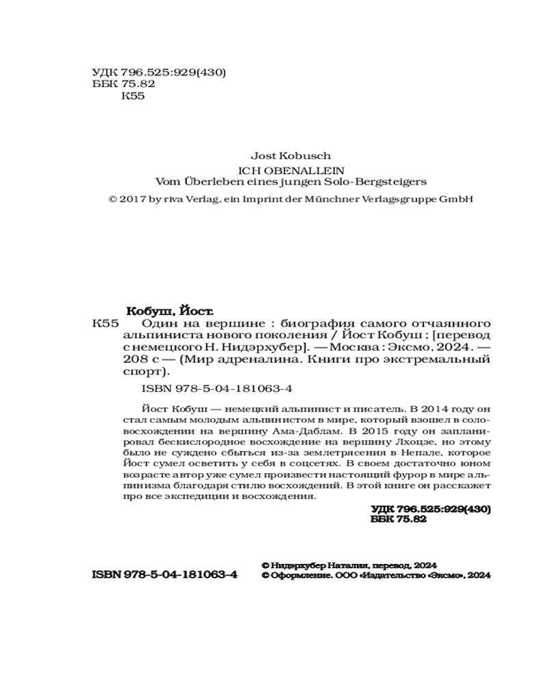 Серия: Мир адреналина. Книги про экстремальный спорт Йост Кобуш — немецкий альпинист и писатель. В 2014 году он стал самым молодым восходителем в мире, который поднялся в соло-восхождении на вершину Ама-Даблам. В 2015-м он запланировал бескислородное восхождение на Лхоцзе, но этому было не суждено сбыться из-за крупного землетрясения в Непале, которое Йост освещал у себя в соцсетях. В достаточно юном возрасте автор уже произвел фурор в мире альпинизма благодаря стилю восхождений. Кому-то Йост может показаться безбашенным смельчаком, кому-то — отчаянным парнем, ищущим опасных приключений, но чего у него точно нельзя отнять — это тяга к горам и авантюризм. |