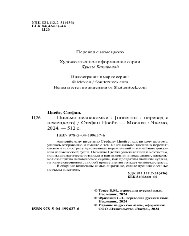 💳 Оплатить за товар можно при получении 🇰🇿 Есть бесплатная доставка по Казахстану от 1 дня 🎁 Копите бонусы с каждой покупки Серия: Белая птица Шокирующая история любви от знаменитого австрийского прозаика, которая была экранизирована более пяти раз. Стефану Цвейгу, как никому другому, удалось откровенно и вместе с тем максимально тактично передать словами всю остроту чувственных переживаний и тончайшие движения человеческой души. Что делать, если твои чувства не взаимны? Какова грань между любовью и безумием? Известный писатель получает письмо от женщины, которая любила его всю жизнь. Она открывает ему неожиданную тайну... В сборник также включены другие новеллы писателя: самые лиричные, самые проникновенные. |