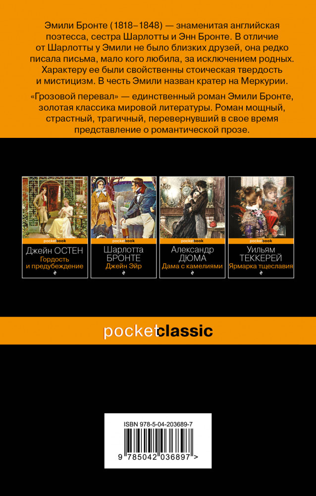 💳 Оплатить за товар можно при получении 🇰🇿 Есть бесплатная доставка по Казахстану 🎁 Копите бонусы с каждой покупки Серия: Pocket Book (обложка) История трагической любви двух диких сердец — одно из самых популярных и узнаваемых произведений в европейской литературе XIX века. Хотя финал истории мрачен, а герои имеют множество недостатков, роман снова и снова находит своего читателя, погружает его в водоворот событий и показывает, насколько многогранной и всепоглощающей может быть любовь... на грани безумия. «Грозовой перевал» был неоднократно экранизирован, а отсылки к сюжету можно найти во многих произведениях о разрушительной страсти. Любовь на фоне мрачных вересковых пустошей приводит к помешательству и смерти героев. Ярость, бунт и привязанность слились в их жизни в единое целое. Чувства диковатого приемыша к сводной сестре не смиряются ни перед логикой, ни перед моралью, над ними не властны ни человеческая сила, ни злой рок, ни даже смерть. Эмоции, полностью поглотившие своего хозяина и сломавшие не одну жизнь, напугали человека викторианской эпохи, но следующие поколения читателей просто заворожили. Этот роман можно любить и можно ненавидеть. Одно однозначно — остаться к нему равнодушным крайне сложно. |