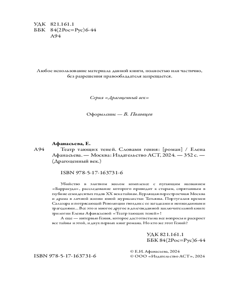💳 Оплатить за товар можно при получении 🇰🇿 Есть бесплатная доставка по Казахстану от 1 дня 🎁 Копите бонусы с каждой покупки Серия: Драгоценный век Убийство в элитном жилом комплексе с пугающим названием «Барракуда», расследование которого приводит к старым, спрятанным в глубине семидесятых годов ХХ века тайнам. Бурлящая перестроечная Москва и драма в личной жизни юной журналистки Татьяны. Португалия времен Салазара и потрясающей Революции гвоздик с ее загадками и неожиданными трагедиями... Все это и многое другое в долгожданной заключительной книге трилогии Елены Афанасьевой «Театр тающих теней»! А еще — интервью Гения, которое даст ответы на все вопросы и раскроет все тайны и этой, и двух первых книг романа. Но кто же этот Гений? |