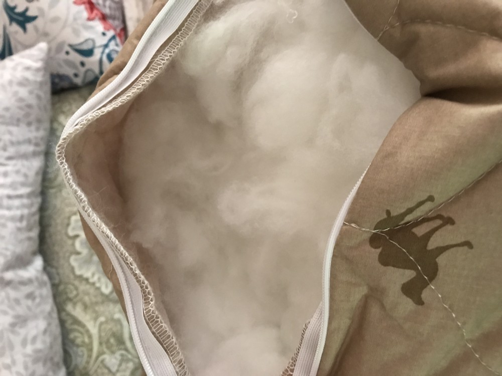 Подушка в хорошем постеганном чехле, замочек хороший. Сам же наполнитель больше похож на синтепон, но, в принципе, подушка устроила. Легкая, хорошо держит форму. А доставка, конечно, без нареканий