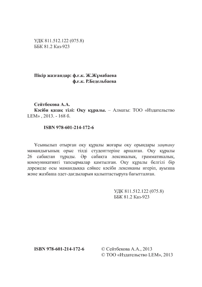 Отзывы «Кәсіби қазақ тілі. «Заңтану» мамандығына арналған оқу құралы»