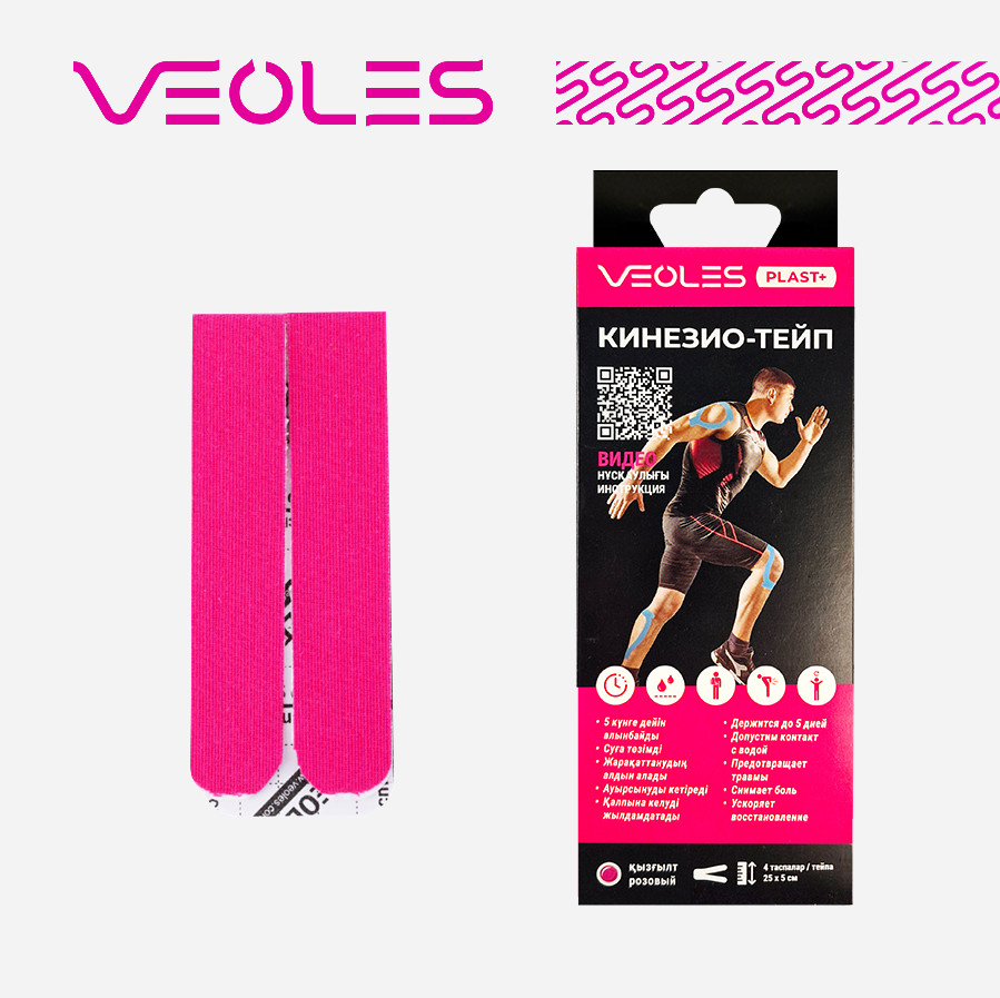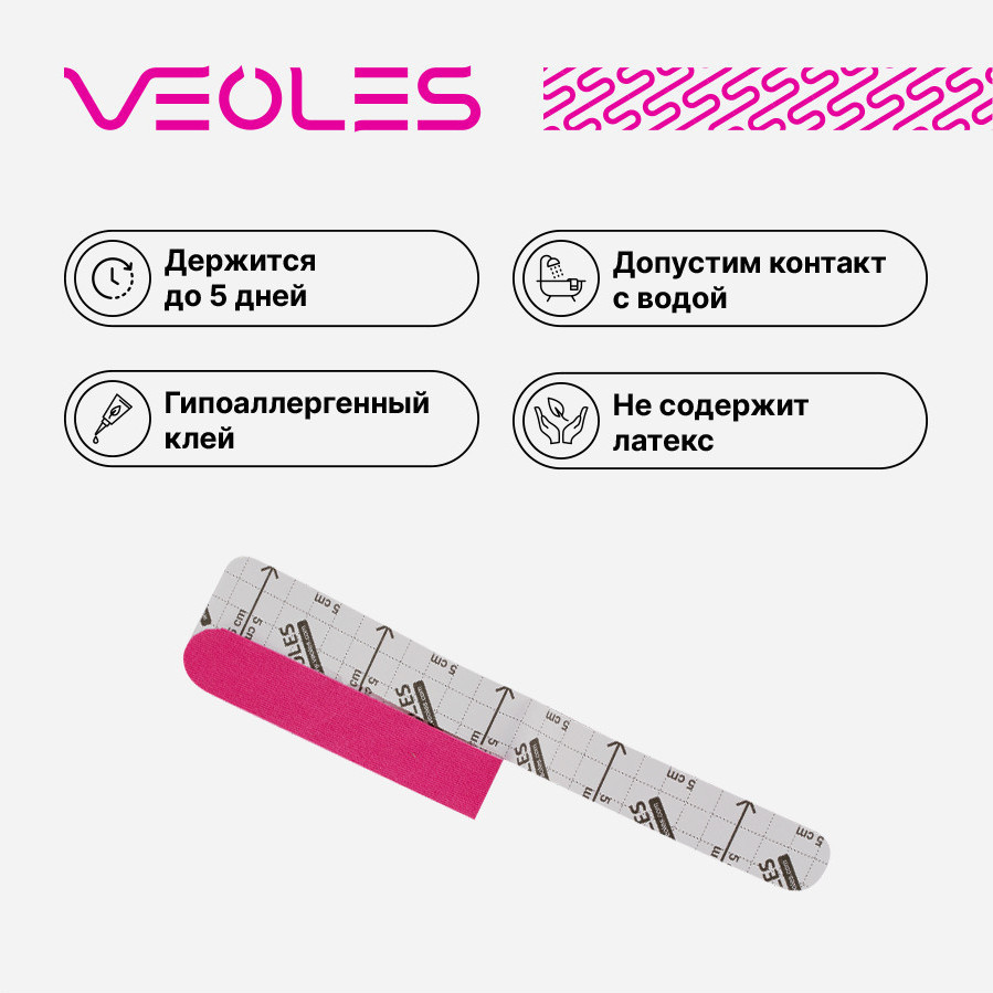 Кинезио-тейп VEOLES — эластичная клейкая лента, тянущаяся вдоль длины до 70% и не тянущаяся поперек. Это свойство позволяет широко использовать кинезио-тейпы VEOLES разных форм и размеров в спортивной отрасли, в индустрии красоты и здоровья, прикладной медицине.