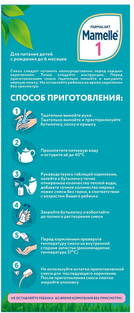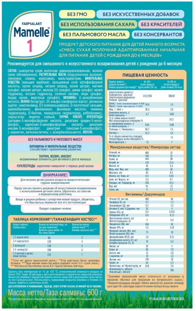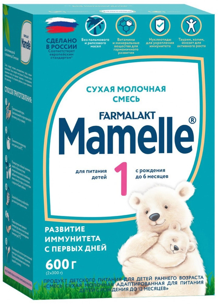 Смесь сухая молочная адаптированная начальная «Mamelle 1» для детей с рождения до 6 месяцев — это сбалансированный состав смеси без пальмового и рапсового масел, обогащенный нуклеотидами, витаминами и минералами.