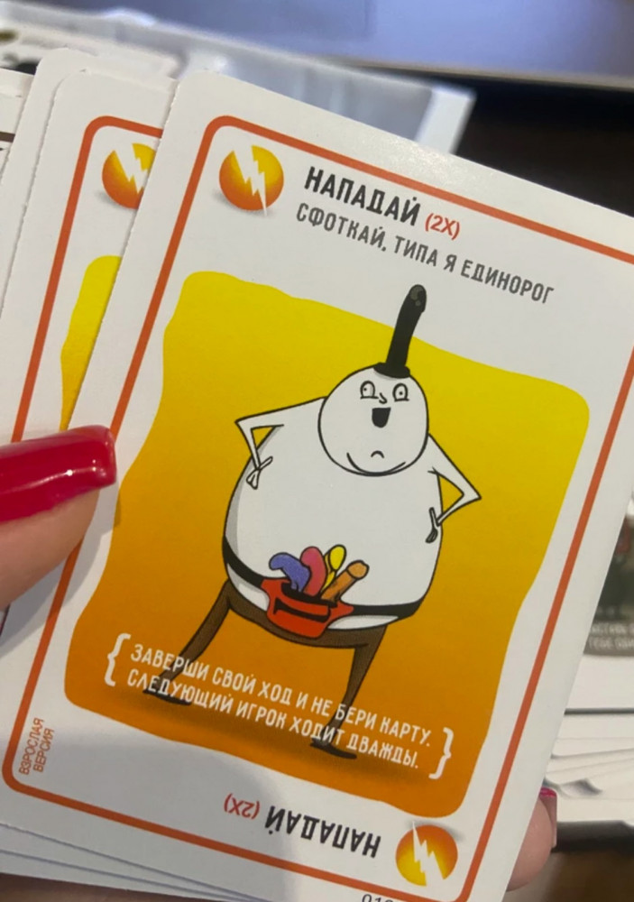 Это самая моя любимая и веселая игра, из всех что я знаю🤣, обожаем просто играть всей семьей, даже вдвоем можно играть, обязательно попробуйте эту игру, ато уно поднадоело, не пожалела о покупке! В игре нужно применять стратегические тактики, что делает игру еще интереснее, все топ в общем