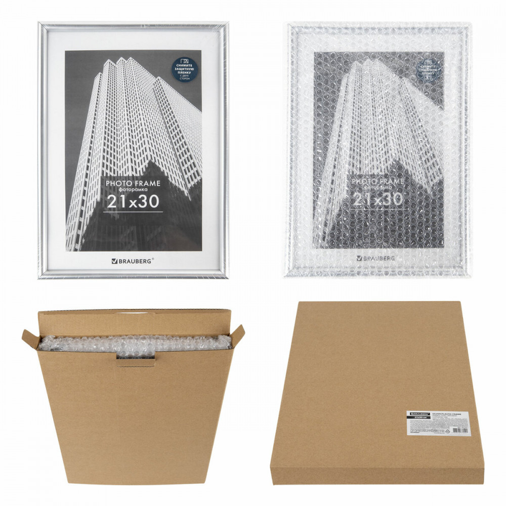 Рамка стандартного формата А4 (21х30 см) выполнена из ПВХ в серебристом цвете, за счет чего отлично впишется как в домашний, так и в деловой интерьер. Имеется возможность вертикального и горизонтального подвеса, а также имеется подставка для установки рамки на столе. Ширина багета — 12 мм, высота — 18 мм. Вставка из акрила вместо обычного стекла делает рамку менее хрупкой. Перед применением снимите пленку с обеих сторон экрана. Задняя панель выполнена из прочного МДФ. Рамка поставляется в термоусадочной плёнке. Для дополнительной защиты от сколов и потертостей она упакована в пупырчатую пленку и индивидуальный трехслойный гофрокороб.