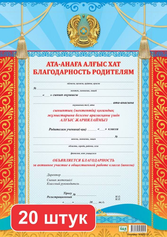 Набор благодарностей родителямВ данный момент этот товар отсутствует в продаже. Возможно, у нас найдется аналогичный или похожий товар здесь. Бланк «Алғыс хат / Благодарственное письмо» используется для выражения признательности сотрудникам, коллегам, партнерам, учащимся. Бланк подходит для черно-белой и цветной печати. |