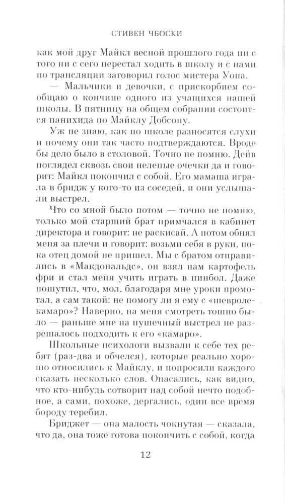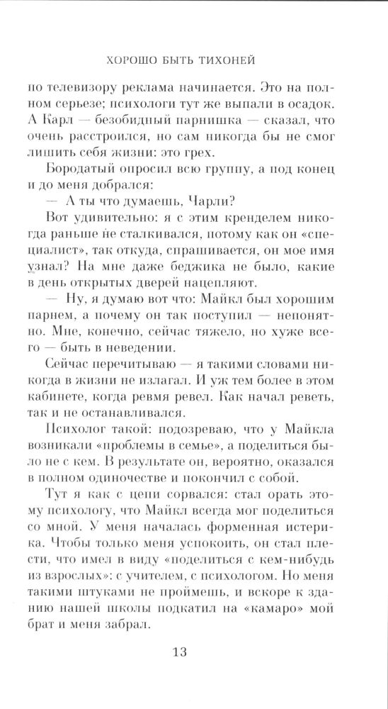 Хорошо быть тихонейлегко читается душевная формат писем качество бумаги глубокие мысли В данный момент этот товар отсутствует в продаже. Возможно, у нас найдется аналогичный или похожий товар здесь. Серия: Азбука-бестселлер Впервые на русском — удивительный бестселлер Стивена Чбоски, трогательный роман взросления («„Над пропастью во ржи“ для новых времен», по выражению критиков), разошедшийся тиражом свыше миллиона экземпляров и экранизированный самим автором, причем одну из главных ролей в фильме исполнила Эмма Уотсон — она же Гермиона Грейнджер из фильмов о Гарри Поттере. Чарли переходит в старшую школу. |