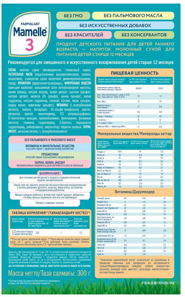 Смесь молочная производится на новейшем современном заводе с соблюдением передовых технологий, а также высоких требований к сырью и качеству детского питания. Отсутствие в составе пальмового и рапсового масел благоприятно влияет на развитие и крепость костной основы, снижается вероятность возникновения колик и запоров у ребенка. Витамины и минералы способствуют полноценному и гармоничному развитию малыша. Нуклеотид положительно влияет на формирование и укрепление иммунитета. Таурин, холин и инозитол — способствуют активному росту ребенка.