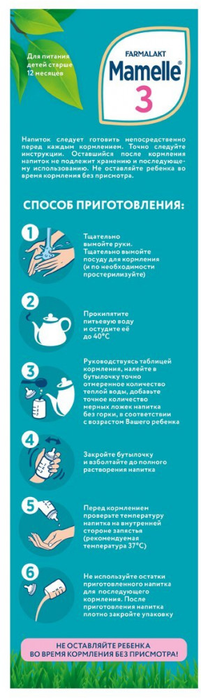 Продукт следует готовить непосредственно перед каждым кормлением. Точно следуйте инструкции, расположенной на упаковке. Не оставляйте ребенка во время кормления без присмотра!