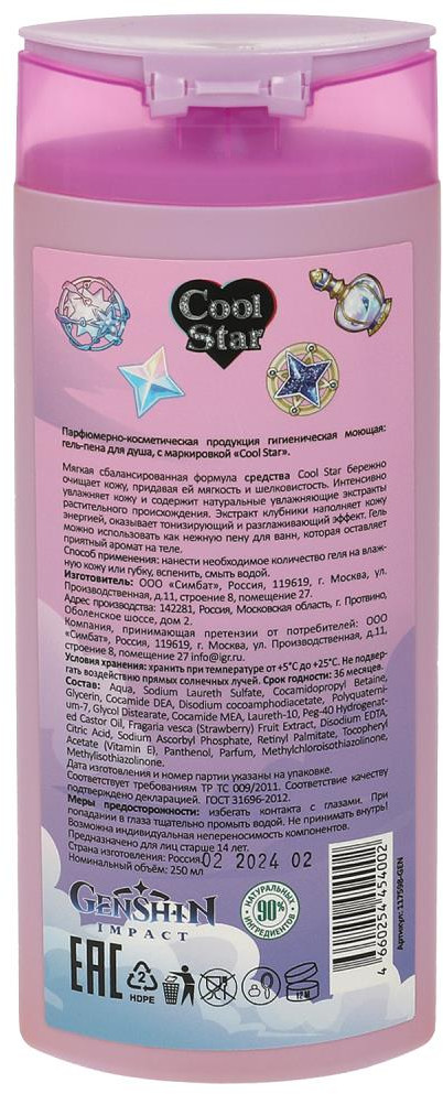 💳 Оплатить за товар можно при получении 🇰🇿 Есть бесплатная доставка по Казахстану от 1 дня 🎁 Копите бонусы с каждой покупки Гель-пена для ванн 2 в 1 «Genshin. Клубничный взрыв» ТМ «Cool Star» — настоящий must-have для ухода за кожей. Этот гель для душа превратит ванную комнату в настоящий спа салон. Гель деликатно очищает кожу без пересушивания, создавая обильные облака воздушной пены. Мягкая сбалансированная формула геля придаёт коже мягкость и шелковистость. Гель интенсивно увлажняет кожу, содержит витамины и растительный экстракт клубники. Экстракт клубники наполняет кожу энергией, оказывает тонизирующий и разглаживающий эффект. Гель можно использовать как нежную пену для ванн, которая оставляет приятный аромат на теле. Великолепный клубничный запах средства создаст в ванной комнате атмосферу роскошного спа-ухода. Стильный гель-пена 2 в 1 с восхитительным ароматом станет также прекрасным подарком. |