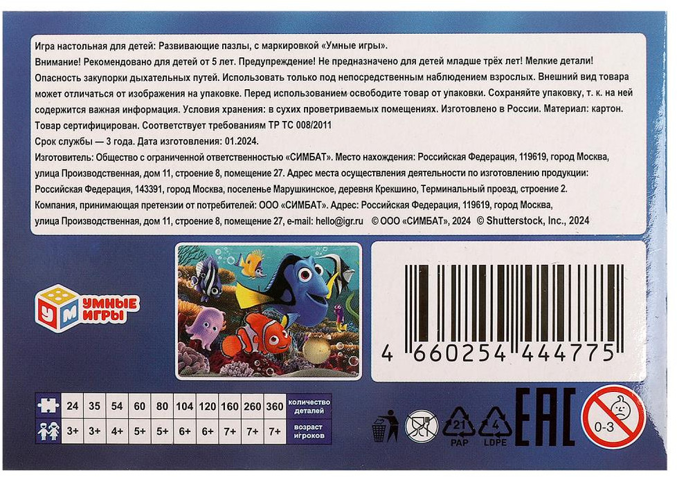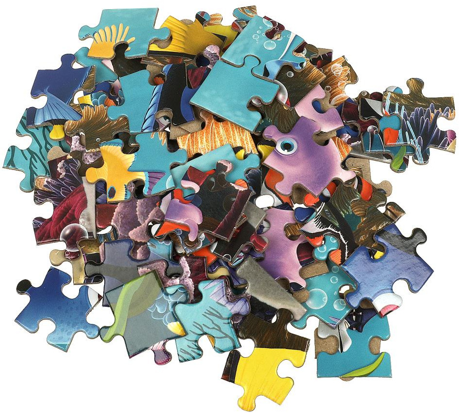 Хоть на коробке и указано 5+, даже взрослая тетя испытывала трудности при собирании данного пазла. Наверное, особый интерес пазл вызовет у тех детей, которые знакомы с мультфильмом "В поисках Немо".